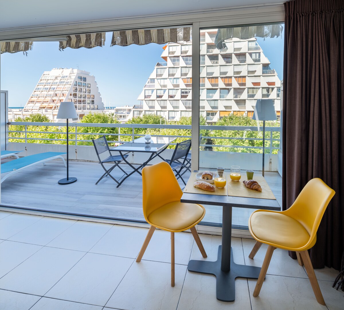 Vous serez à 5 minutes à pieds de la plage et des commerces, en plein centre de la station balnéaire. Le studio, entièrement rénové, est équipé pour 2 personnes, au 3éme et dernier étage de la résidence. La terrasse donne sur la place du marché et offre une vue imprenable et dégagée sur les pyramides iconiques de la Grande Motte avec une petite échappée sur le port et la mer. Dormez dans un vrai lit 160 X 200 et voyagez léger, le linge de maison est inclus. WIFI gratuit.