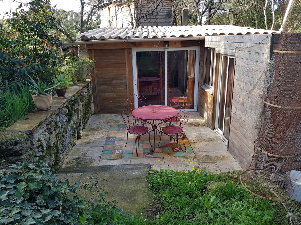 Location à la nuit, au week-end ou à la semaine dans l'Hérault entre Sète et Montpellier, d'une petite maison sur terrain arboré construite en pierre et bois, contre la roche, dans l'angle d'une ancienne carrière. Sa magnifique baignoire intégrée dans la roche lui donne un charme exceptionnel. Il s'agit d'une belle chambre/salle de bain avec une petite cuisine accolée. Détente assurée aux chants des oiseaux sur la belle petite terrasse. Belle balade à faire dans une belle carrière. Bienvenue