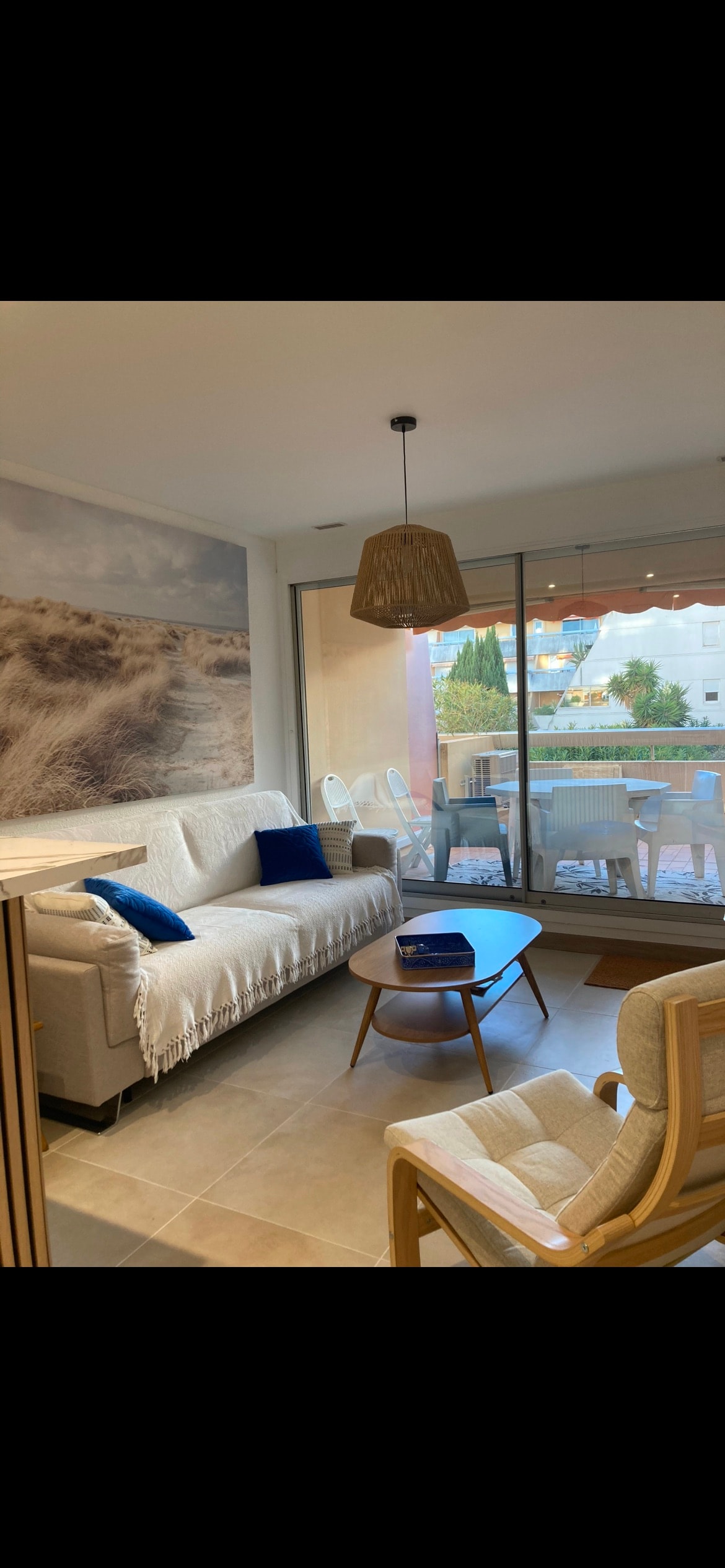 Quartier le Couchant. Studio 34m2 (!) climatisé, refait à neuf au 4 étage dans résidence de standing avec piscine, ascenseur et parking privé au pied de l'immeuble. Situé à 150m de la plage et des commerces, au milieu d'un parc de pins méditerranéens. Grande terrasse 60m2(!) ensoleillée avec salon de jardin, 2 bains de soleil, table de jardin, aperçu de la mer, un olivier, cris des mouettes...Très bien équipé. Résidence sécurisée par portail électrique et digicode à l'entrée de l'immeuble.
