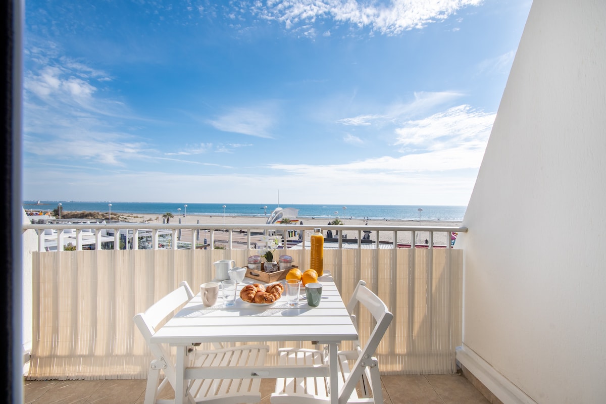 La plage au bas de l'immeuble est un vrai plus ! Linge fourni GRATUITEMENT,PARKING,WIFI Sans parler de la vue sur la mer...4eme et dernier étage personne au dessus !!! L'appartement 27 m2 plus la terrasse première ligne face à la mer,ASCENSEUR chambre séparée lit double 140 sur 190, salle de bain,toilettes séparées, salon avec coin cuisine équipée, terrasse vue mer Parking privé barrière automatique, local vélos, je ne garantis pas sa sécurité. 5 minutes à pieds : Thalasso,centre ville.