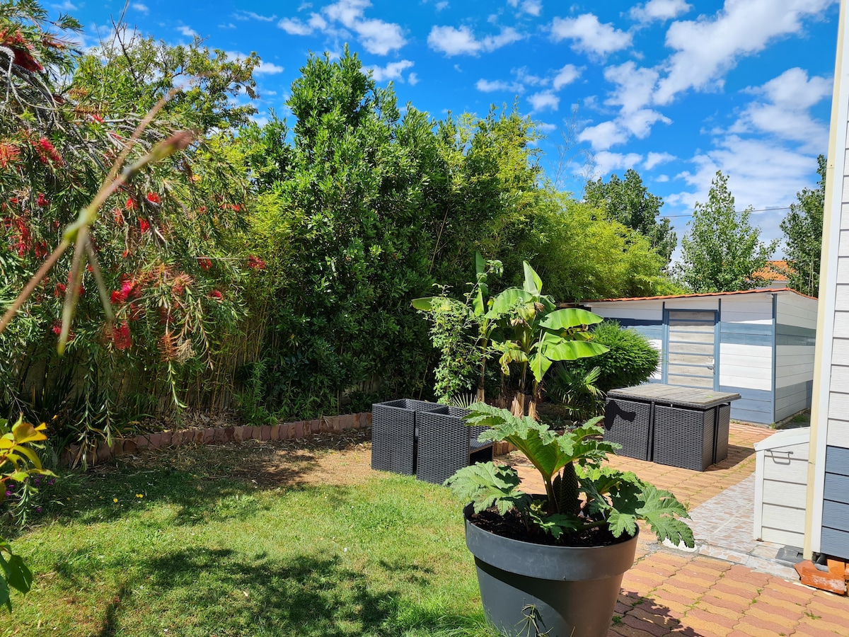En haut du domaine de la Pironniere dans une allée calme. Tout à pied ou en vélo: 400m de la plage de Tanchet et du lac, 650 m des commerces et du marché de la Pironniere,500m de la thalasso,500 m du casino ,2 kms du centre Aqualonne ,600m des tennis,3kms du centre ville des Sables d'Olonne . 34m2: Pièce à vivre 25m2 donnant sur le jardin ,cuisine ouverte,salle de bain,wc indépendant, laverie,parking privé. Parfait pour couple,voyageur d'affaire, famille(avec 1 enfant) 2 vélos à disposition.