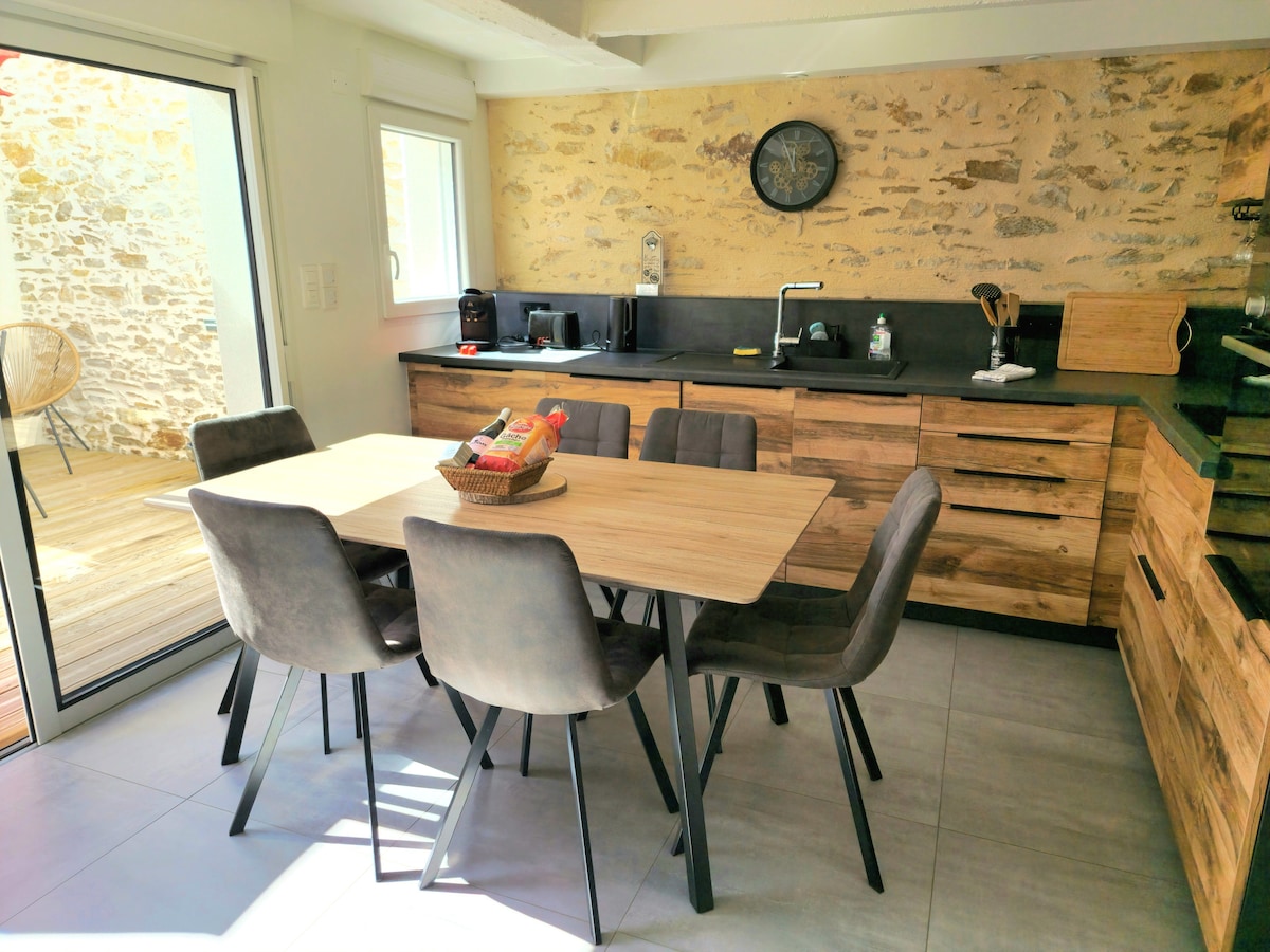 maison au calme d'une petite rue typique sablaise piétonne .elle a été entièrement rénovée en 2023 ,elle vous offre 60 m2 sur 2 niveaux pour votre famille,composée d'une pièce de vie avec cuisine haut de gamme,d une suite parentale,une salle d eau et 2 autres chambres. une terrasse de 20 m2 entièrement clos idéalement situé à 5 mn à pied de la gare et 15 mn de la grande plage des sables. les stationnement sont gratuits dans la rue et des navettes gratuites sont disponibles pour les plages