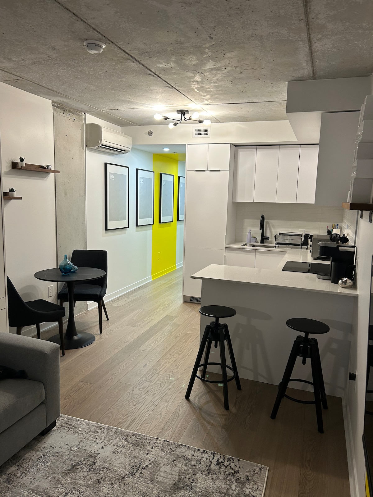 This is a modern 1 bedroomunit , fully equipped and decorated by a professional designer is located in the heart of Montreal's downtown neighbourhood (Place-des-arts area) Few steps away from Saint-Catherine, Saint-Denis and Saint-Laurent streets with their restaurants, bars, cafés, cinemas and shops of all kinds. It is 3min w/distance to Saint-laurent metro and 5min w/distance to the central Berri-UQAM metro station and 10min to Old Port, where you get experience the fast pace lifestyle.