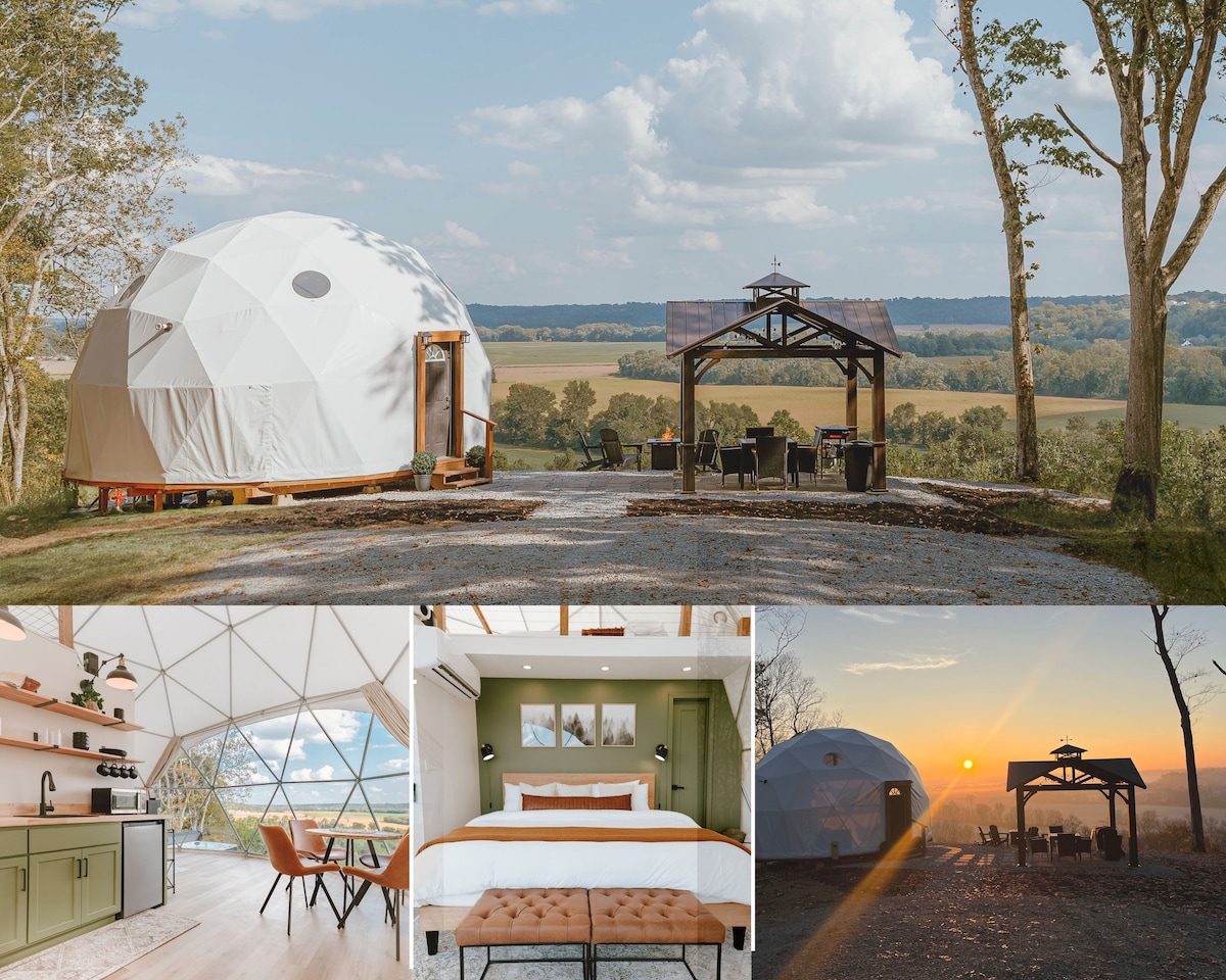 An elevated camping “glamping” experience. This brand-new one of a kind geodesic dome is located on a private road that leads you to an overlook featuring one of the most beautiful countryside views in Kentucky. While this getaway experience is nestled deep in the woods, it is also a close drive to all the conveniences you can imagine. This is an off the grid outdoor experience with a ½ mile gravel road including a steep hill. AWD or 4WD advised.