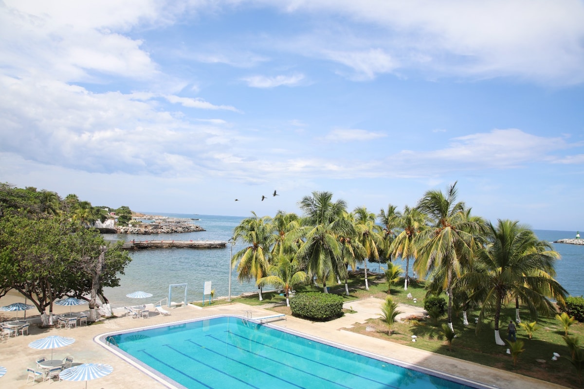Relájate en esta escapada única y tranquila. vista plena al Mar, espectacular piscina, Snack Bar servicio de comidas, vig las 24 horas, estac, 1 habit, 1 cama matrimonial, 1 sofá /cama dentro de la misma hab. cocina, horno , microondas, cafetera, agua caliente, tanques de agua, 2 TV, muebles, wifi,2 aires acondic. Playas y balnearios públicos y privados a 6 minutos , "se debe trasladar en auto" Llenado de tanques a diario al salir del departamento. Piscina los lunes en mantenimiento.