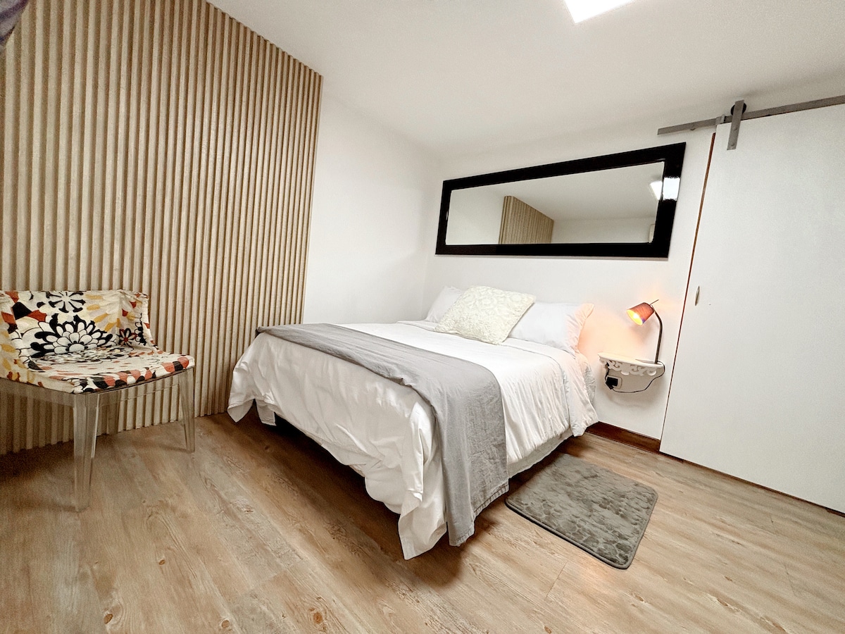 ¡Tu Refugio céntrico te espera! Nuestro apto, ubicado en el centro neurálgico, te coloca a pasos de comercios, restaurantes y transporte. Dormitorios Premium: Dos habitaciones con A/C. La principal con cama King y baño privado. La secundaria con cama doble e individual. Ambiente Moderno: Disfruta de una cocina concepto abierto, totalmente equipada. ¡Además, tienes lavadora y secadora para estancias largas! Confort Garantizado: Aire acondicionado y ventilación natural en todos los ambientes.