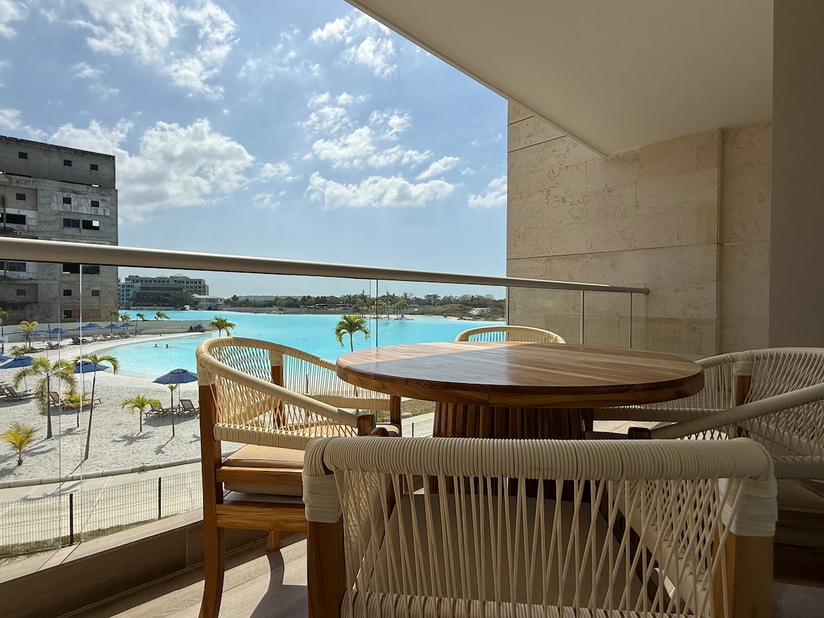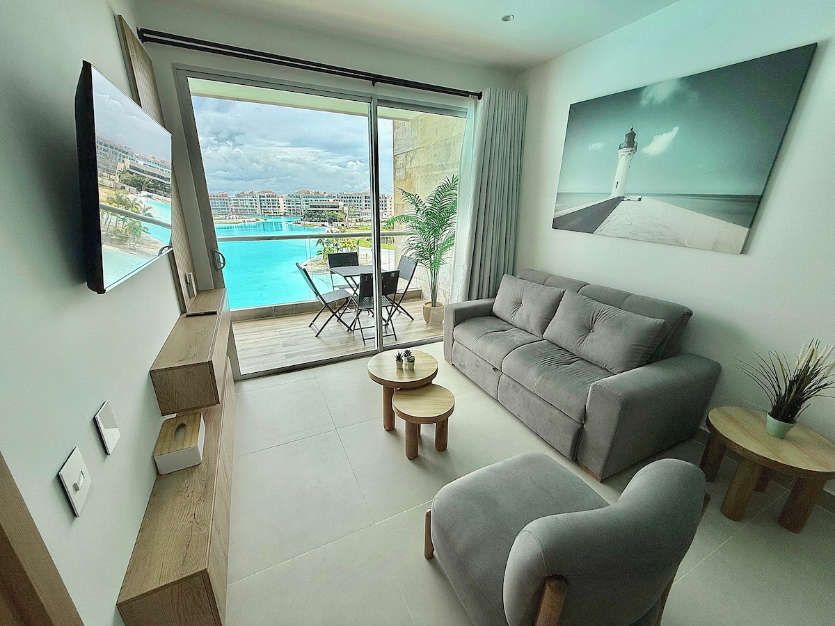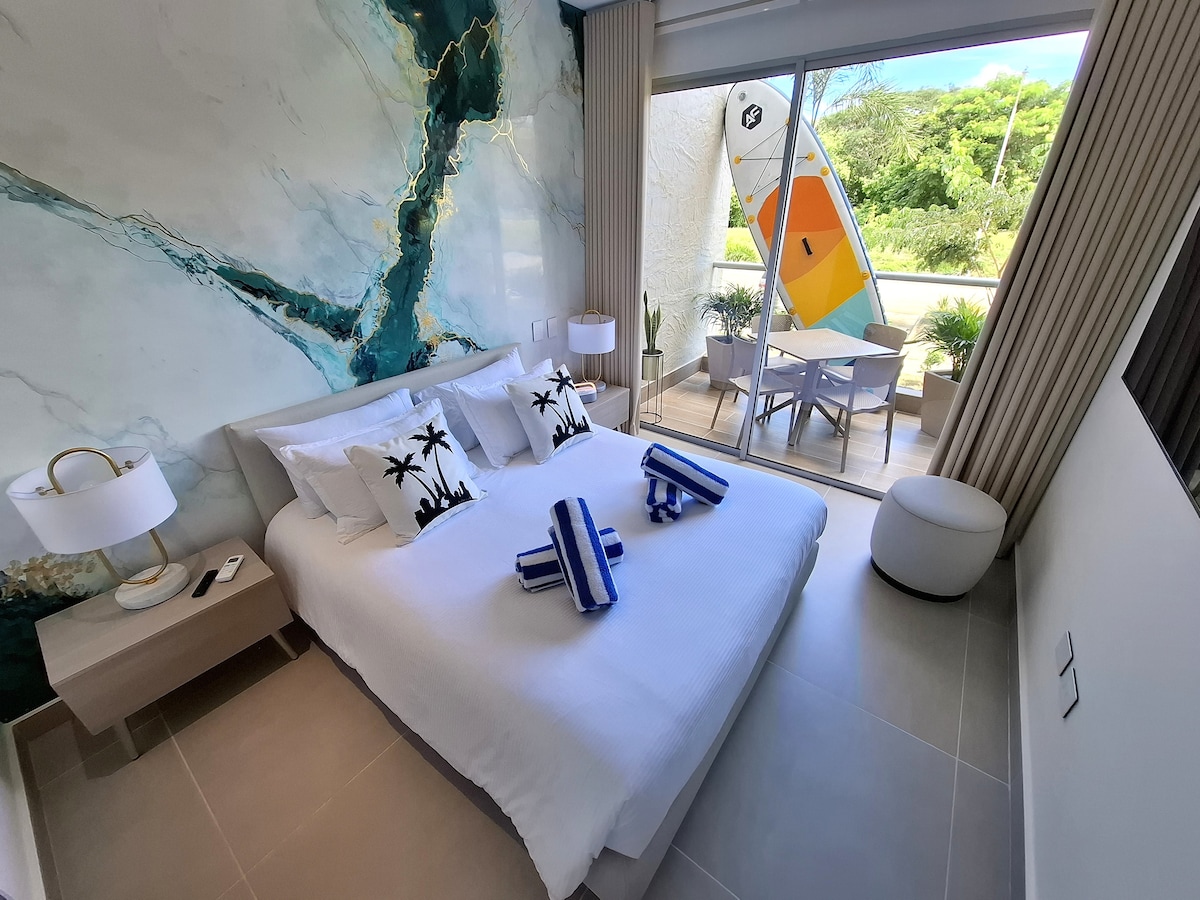 Welcome to your suite apartment in the crystal-clear waters of Baia Kristal! Enjoy an unforgettable vacation in Cartagena in this modern one-bedroom suite, featuring a living room with a sofa bed, a fully equipped kitchen, a balcony, and access to the incredible Crystal Lagoon pool, perfect for relaxing or practicing water sports. It includes a paddleboard, shopping cart, and a cooler for drinks on the beach. This suite is ideal for couples or families seeking comfort, fun and relaxation.