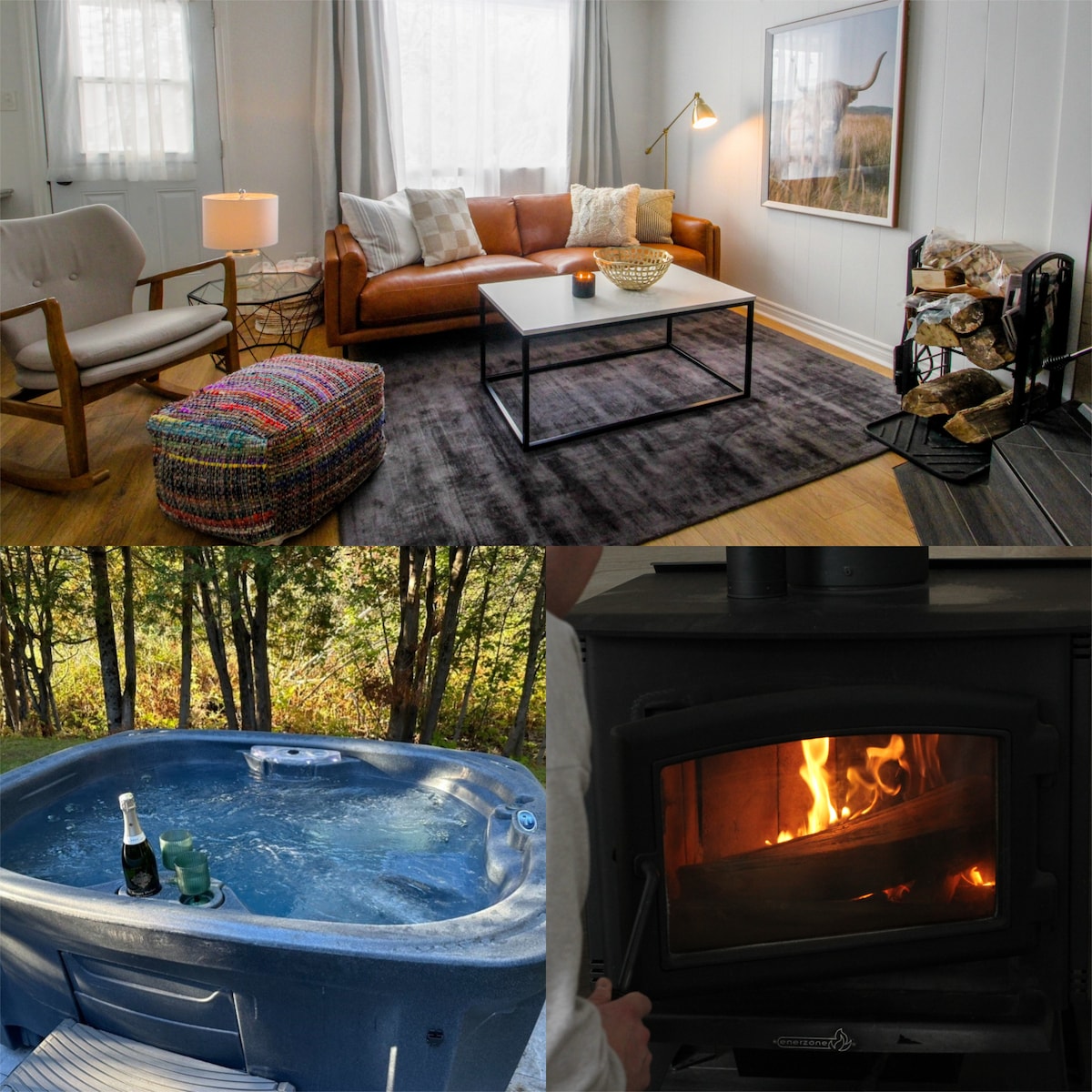 La cuisine du chalet est équipée de tout le nécessaire pour que vous puissiez préparer de délicieux repas. Avec ses deux chambres composées de lits Queen douillets, notre chalet peut accueillir confortablement jusqu'à 4 personnes. Le salon, avec son foyer au bois, invite à la détente... Profitez de moments conviviaux avec vos proches dans cet espace confortable.