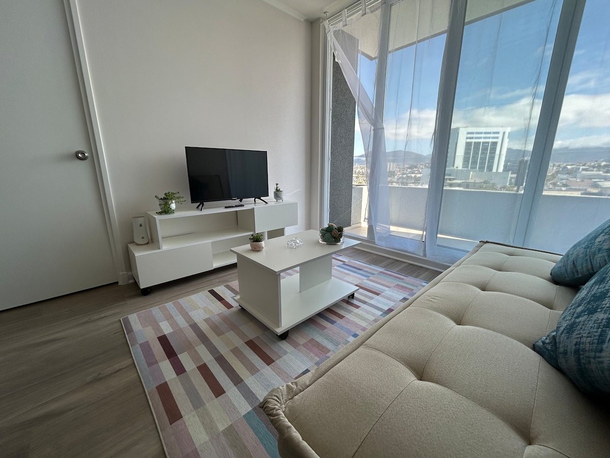 Exclusivo departamento, moderno, cómodo y seguro. Ideal para una grata estancia de viajeros de paso o escapada. Se encuentra en el piso 15° con una vista panorámica inigualable, amplio balcón. Estacionamiento al interior del recinto, Wifi, gimnasio, quincho, piscina. Lavandería (con tarjeta de prepago). A pasos de Hospital San Pablo, UCN, Estadio Francisco Sánchez Rumoroso, Mezquita.