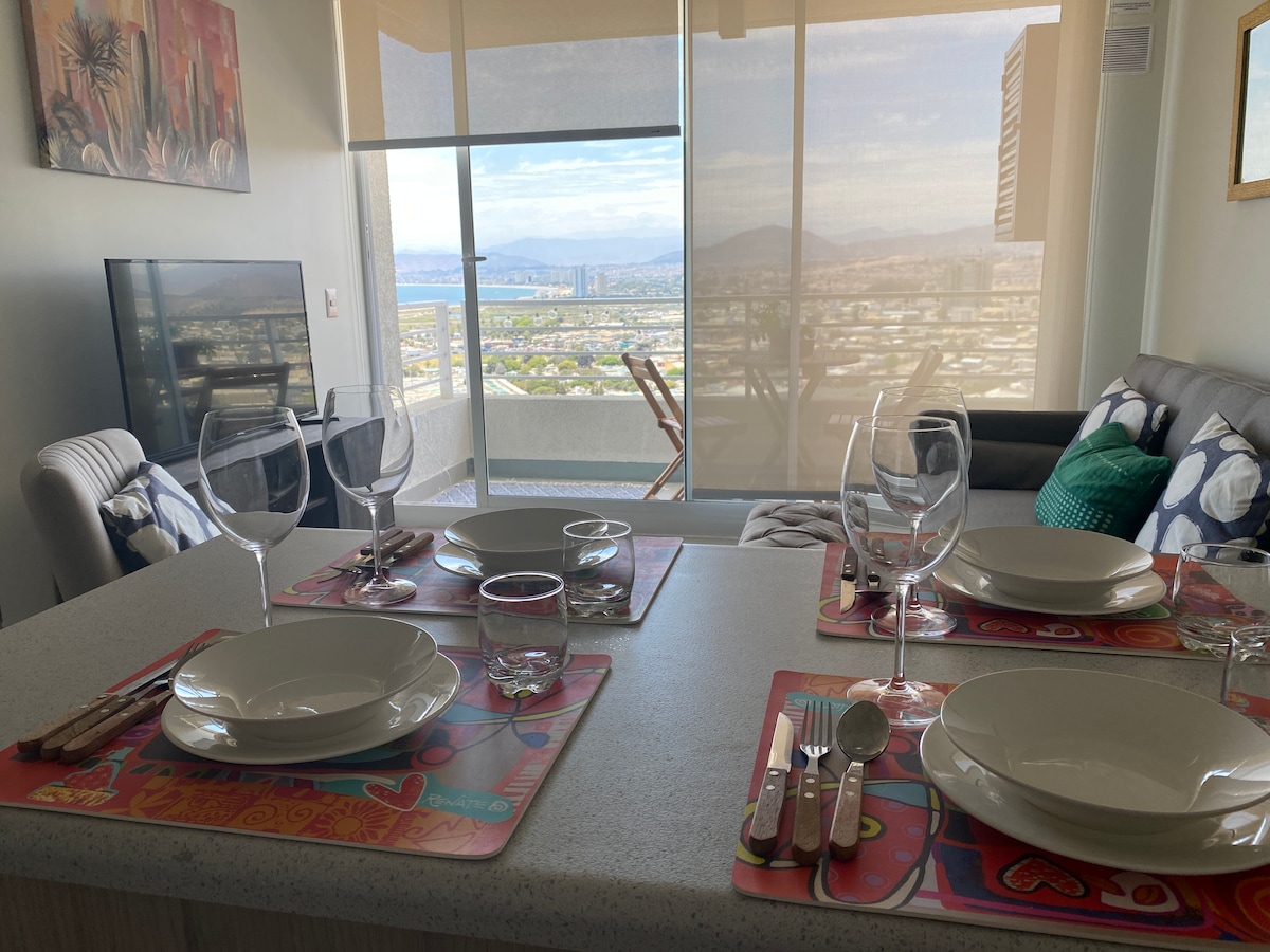 Exclusivo departamento, moderno, cómodo y seguro. Ideal para una grata estancia de viajeros de paso o escapada. Se encuentra en el piso 15° con una vista panorámica inigualable, amplio balcón. Estacionamiento al interior del recinto, Wifi, gimnasio, quincho, piscina. Lavandería (con tarjeta de prepago). A pasos de Hospital San Pablo, UCN, Estadio Francisco Sánchez Rumoroso, Mezquita.