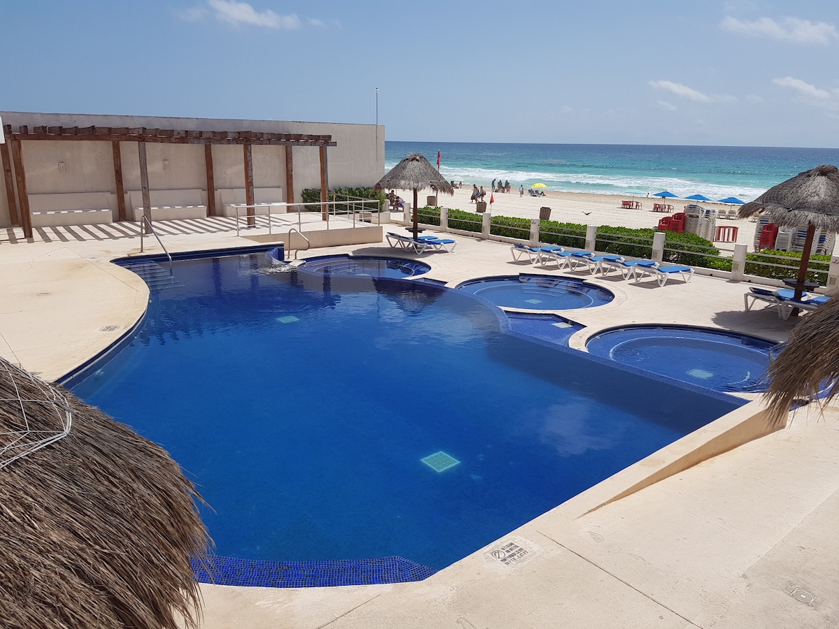 Beautiful ocean front Villa right on the beach, inside a gated Condominium with 3 pools, jacuzzi, snack bar next to the pool, security 24/7 in a great beach area of Cancun hotel zone. Supermarket, shopping malls and variety of restaurants in the other side of the road. You can´t be closer to the beach! Wifi, Ac, balcony and a patio facing the ocean. Parking lot, tennis court, bus stop right off the condo, airport transportation provided with our private driver (additional price).