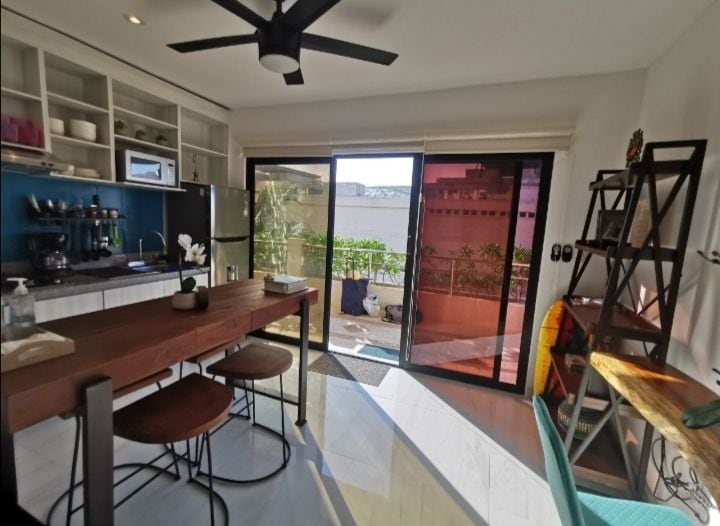Recently renovated studio located right in the heart of the Cancun hotel zone, with a beautiful terrace and a breathless ocean view near by restaurants and night live fun activities. The studio has a modern touch with a beautiful terrace to spend time and enjoy the view and the ocean sounds with a cup of coffee, some wine or simply relax in the hammock. It has two queen size beds, a sofa type bed, a well equipped kitchenet and a dining table. It also has a flat screen tv and wifi service.