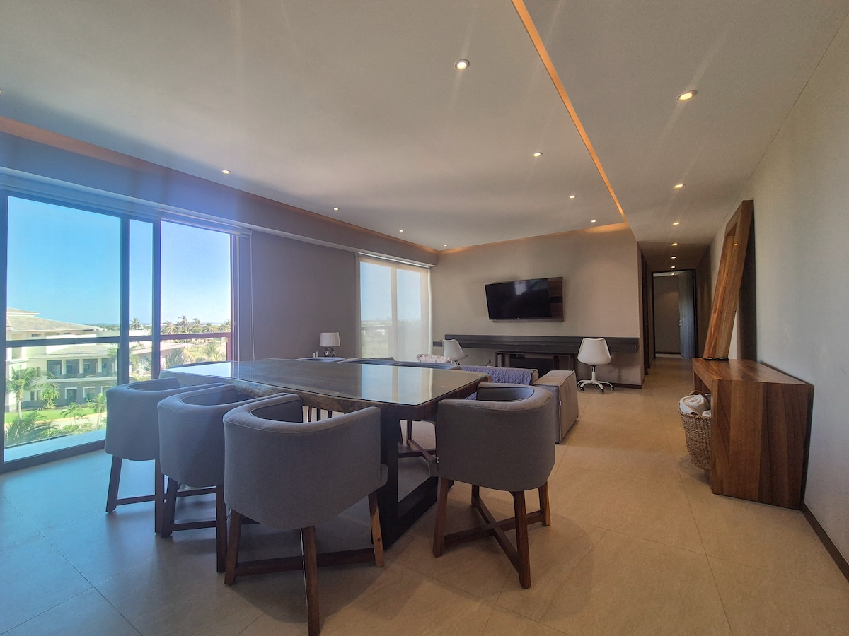 Lujoso, privado y amplio departamento de 4 habitaciones ubicado en el grandioso edificio Hawai, vista a amplias áreas verdes, múltiples albercas, toboganes, canchas, amenidades en casa club para adultos y niños, club de playa y playa privada con excelente servicio de comida y bebidas. Cuenta con todo lo necesario para que su experiencia sea única e inolvidable en un ambiente familiar, de sana diversión y esparcimiento y por supuesto de descanso acompañado siempre de privacidad y exclusividad.