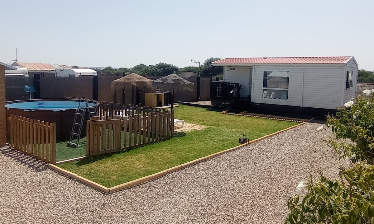 Bonita casa de madera situada en la playa virgen de El Palmar en Cádiz. Se encuentra situada a 650 metros de la playa. La casa se compone de dos dormitorios, salón y baño privado. Dispone de espacios comunes como son el jardín con piscina, tumbonas, sombrillas y ducha, la cocina, la cual dispone de dos fuegos para poder cocinar y menaje, y la zona de barbacoa/cenador. La parcela acoge en total 3 bungalow de madera, alojándose en uno de ellos el propietario para poder facilitar la estancia.