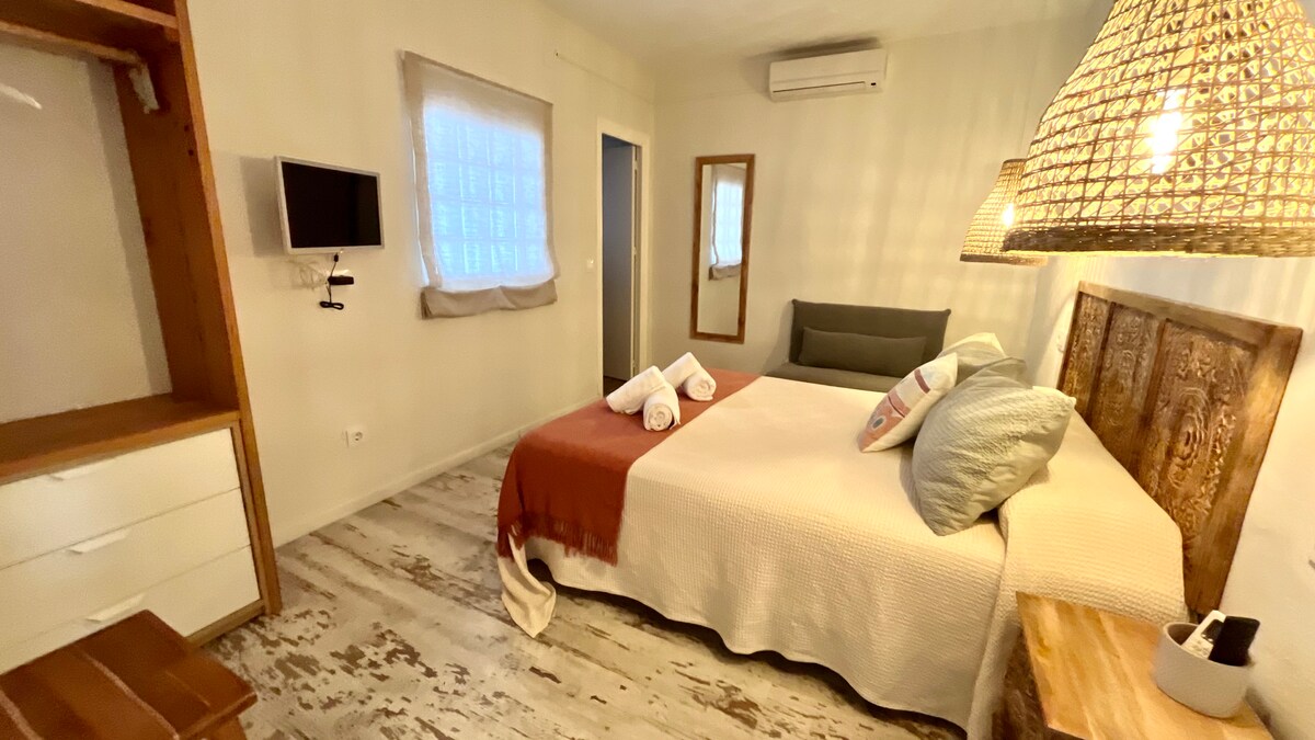 Room located in a building in the heart of the old town of Tarifa in one of the quietest streets very close to bars and restaurants and 10 minutes walking from the nearest beach, inside the building they have a shared kitchen, living room, terrace and upper patio, this Room is located on the upper terrace without elevator has a 2.00m bed, with private bathroom, the bathroom is opposite the room, has air conditioning.