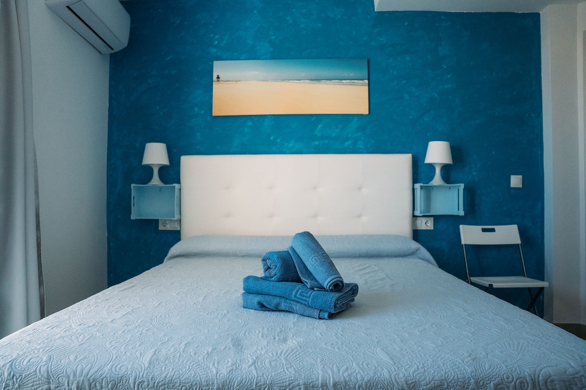 Habitacion de 2 camas de 90 y con su baño completo. Esta situada en la primera planta algo interior pero se puede acceder a una terraza exterior compartida. Ropa de cama, toallas, gel de baño y secador de pelo bajo petición. Tv y aire acondicionado. Situada a solo 2 minutos de la plata de Valdevaqueros y dolo 5 minutos del centro histórico. Se accede a ella por escalera o por ascensor.