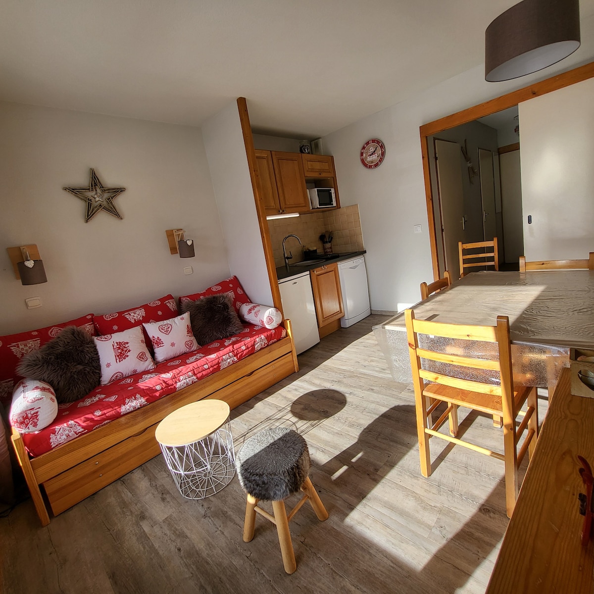 Cocon chaleureux au pied des pistes, avec terrasse plein sud et vue imprenable sur les montagnes. Ici, on chausse les skis depuis la porte, on partage une fondue le soir et on savoure le calme de la nature. Ambiance montagne, cuisine équipée, TV connectée, parking couvert, animaux bienvenus… En accès direct depuis l’immeuble : galerie marchande avec restos, bars, location ski/VTT, supermarchés. Un lieu simple et unique pour se ressourcer, été comme hiver.