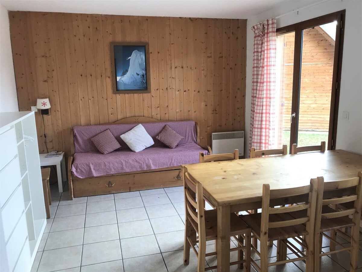 Studio de 23m² et une terrasse de 6m², pour 4 personnes, au 1° étage sans ascenseur, exposé plein Sud. Il est à 50m des pistes et de l'école de ski, à 100m de tous commerces (boulangerie, supérette, restaurants, cinéma, médecin, pharmacie, garderie, laverie...) En hiver: 100 km de pistes alpines, 43 km de pistes de fond, 23 remontées mécaniques, snowpark, piste de luges, traîneaux à chiens. En été: randonnées (GR), escalades, tennis, piscine, balnéo.