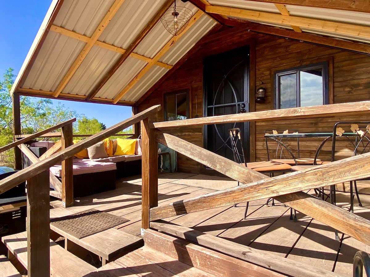 Take it easy at this unique and tranquil getaway. Relax and unwind or visit our local historical sites or spend time with our amazing critters. This cabin is a stunning Dios de la Muertos themed cabin with an amazing spa shower. The custom shower features 5 separate shower heads to choose from. It is adorned with Dios de la Muertos tile and the most gorgeous rocks that were found in the area (rockhounding tours avail) and cut and used as a border in the wall tile. There's a bidet toilet feature.