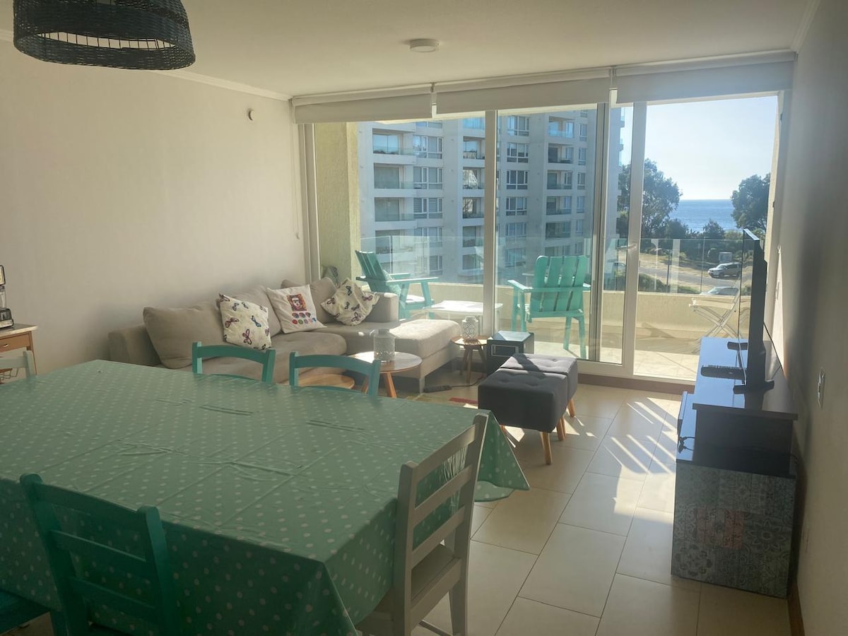 Depto, 7 personas, wifi, smart tv. Maravillosa vista al mar. Sin ráfagas. Roller blackout. Cocina y comedor equipados, parrilla. No incluimos sábanas ni toallas. Cama King pieza principal. 1 o 2 estacionamientos. Primera línea, salida directa a playa. Múltiples áreas comunes canchas fútbol y tenis, 3 piscinas y laguna navegable con kayak incluidos. En la playa hay quitasoles y cancha de Volleyball. Muy cerca playa los Lilenes, bosque de eucaliptos. Restaurantes y pubs a pasos del condominio.