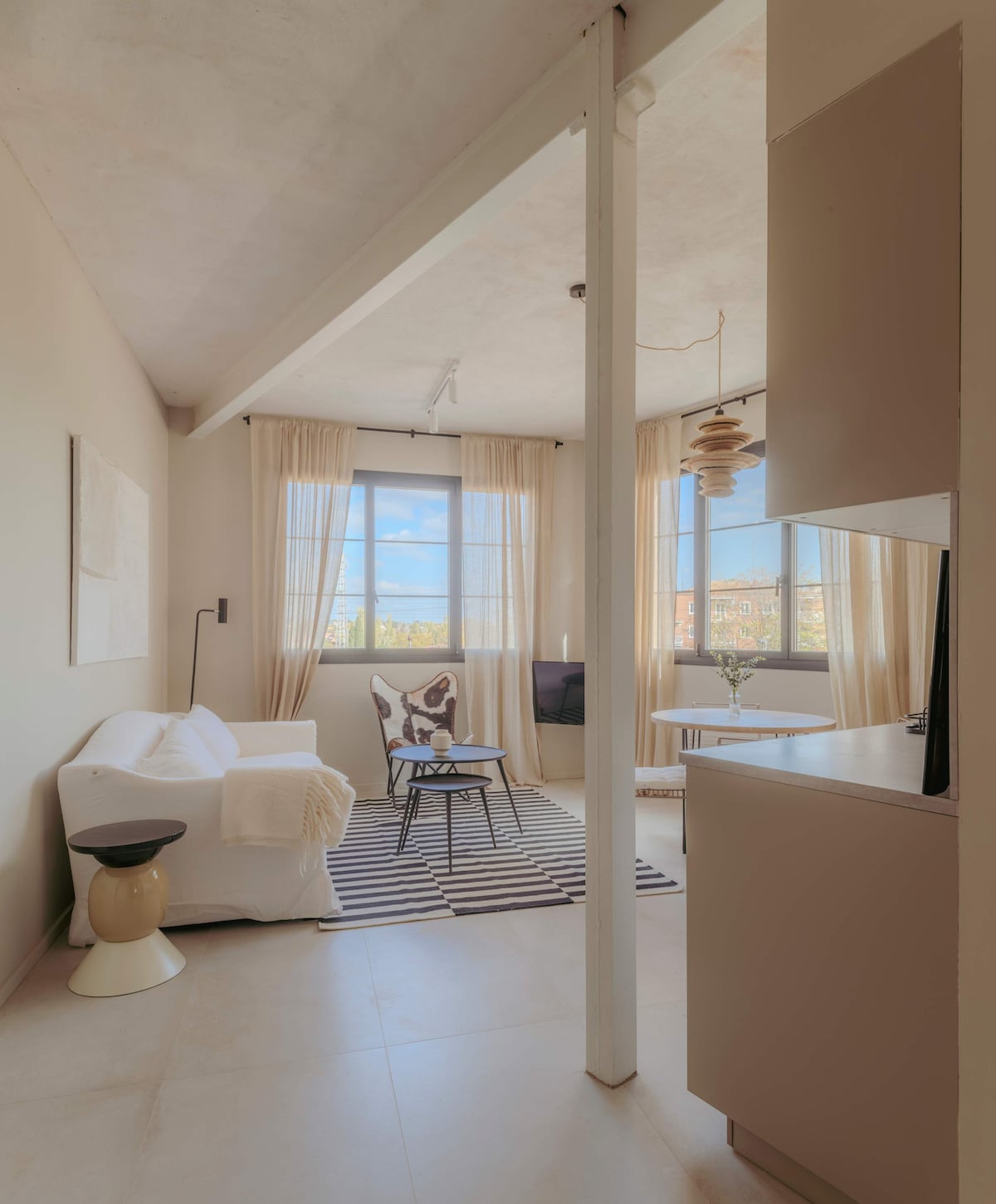 Our 120m plus 40sqm terrace penthouse is high standard in all ways. It is a spectacular specious loft with an artístic bohemian yet very elegant and comfortable feel. It has a big kitchen open to the living room and to the terrace. Main bedroom suit with a king size bed and beautiful shower, big wardrobes and sound proofing windows all round.