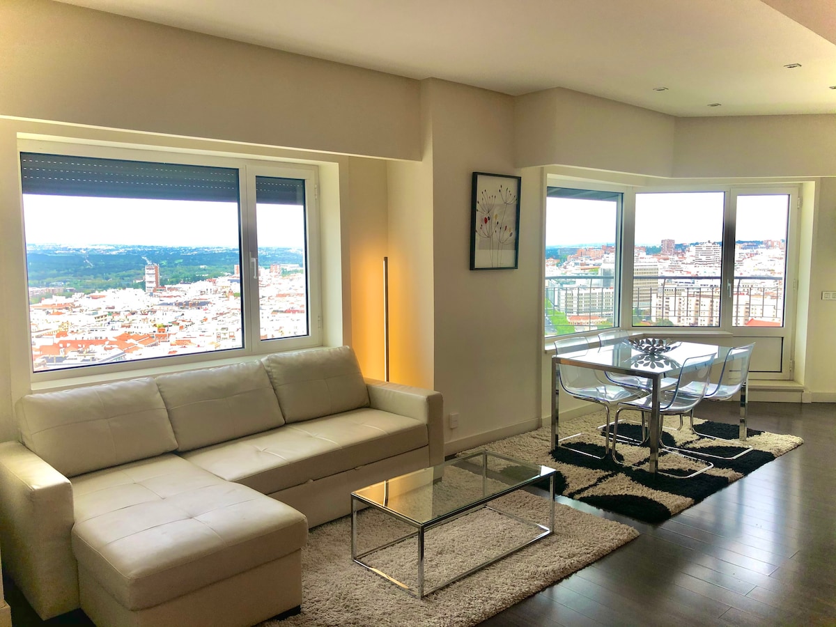 Apartamento de lujo en la planta 25 del edificio emblemático Torre de Madrid, en la Plaza de España, con vistas excepcionales. 85 m2 distribuidos en salón, cocina, baño, dos terrazas abalconadas y dos dormitorios con las mejores calidades. Domótica, Wifi, con calefacción y aire acondicionado individual, vigilancia y seguridad 24 horas. Con acceso y disfrute privado a la zona Vips situada en el ático con gimnasio de lujo, club social y terraza solárium panorámica 360º con vistas únicas.