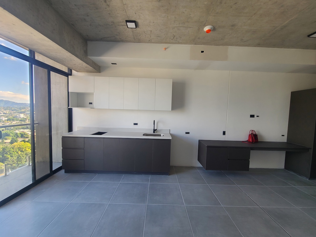 Apartamento nuevo, totalmente equipado y amueblado con una sola cama matrimonial, con decoración moderna pensado en garantizarte una cómoda y agradable estadía. Ideal para relajarte, disfruta de tu café por la mañana en la terraza con una gran vista a la ciudad o disfruta una copa de vino en la noche con la excelente vista a San Salvador. En una zona céntrica, estratégica y segura, cerca de supermercados, centros comerciales. A solo 40 minutos del Aeropuerto,