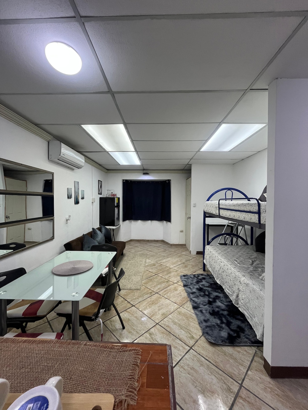 Mini Apartamento: 1 habitación y sala con A/C, Smart-TV- Cable, Wifi 80 mbps, cocina, área de lavado compartida, en zona residencial segura. Se encuentra a 45 minutos del aeropuerto, 5 minutos caminando al Centro Comercial Plaza San Luis, Hospital Militar y 15 minutos en vehículo a Metrocentro. A sus alrededores fácil acceso a restaurantes, supermercados, farmacias, servicios de bus, Universidad Nacional, etc. Disfruta de una linda experiencia en este céntrico alojamiento.