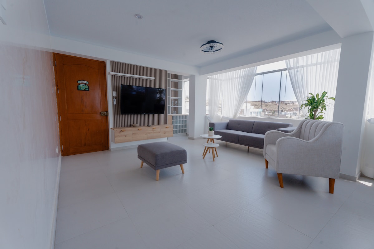Relájate en una cómoda suite privada dentro de un moderno departamento, a solo 3 cuadras del muelle de Huanchaco. Disfruta de tu propia habitación con baño privado y acceso a la sala, comedor, cocina equipada y lavandería. Perfecta para parejas, viajeros solos o quienes buscan tranquilidad sin renunciar a la comodidad del hogar.