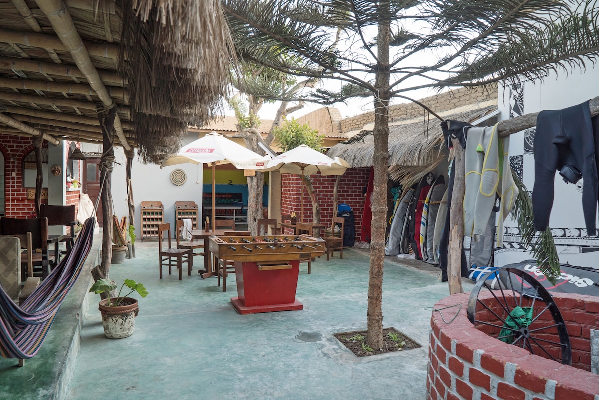Private room with two beds (a double bed and a single bed) with a bathroom with hot shower in a house 2 blocks from the beach. Access to kitchen, living room and deck (w/hammock). We've wifi and can rent bikes, surfboards & wetsuits.