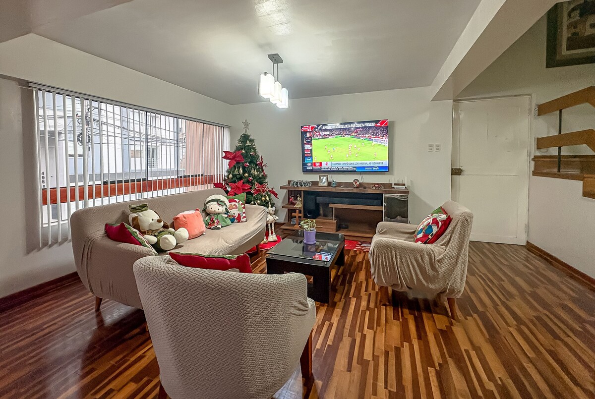 En la mejor zona residencial, cerca a supermercados, boulevard de restaurantes y cafeterias.Con Internet de alta velocidad,tv de 65" y 3 amplias habitaciones para 5 huéspedes. Cocina amplia con mesa de vidrio,cafetera eléctrica,microondas, licuadora,refrigerador y menaje de cocina.Therma y lavadora incluida.Un ambiente familiar con amplias habitaciones y espacios.A menos de 50 mts del parque grande de California y rápido recorrido al aeropuerto.
