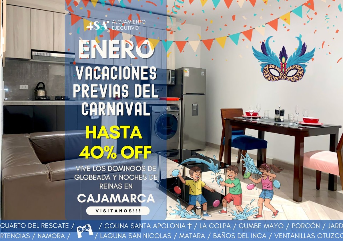 Máxima higiene en nuestro moderno departamento estudio de estreno a 5 minutos de la plaza de armas y de los Centros Comerciales. Implementado con todo lo necesario para vivir una confortable estadía en la mejor zona urbano residencial, céntrica y segura de Cajamarca. Agua caliente en todas las llaves, cocina totalmente equipada, todos los artefactos y utensilios requeridos, acceso a wifi de alta velocidad y tv de 55”.