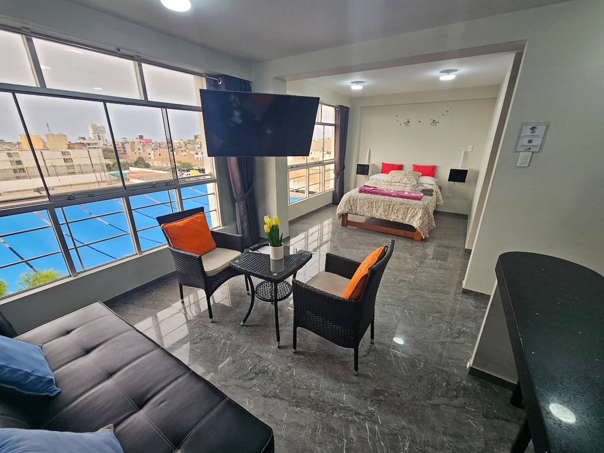 Excelente Loft de 35 metros, cerca del centro de la ciudad, Cama King Say de 2x2mtrs, SamrTV de 60" Samsung, Netflix. Baño privado con agua caliente en la ducha, cocina full equipada, Frigo bar, juego de ollas, hervidor, micro hondas y los utensilios de cocina, escritorio para laptop, full moderno. En el mismo edificio se encuentra un minimarket bien equipado y con agente BCP, estacionamiento pagado previa coordinación. 4to piso.