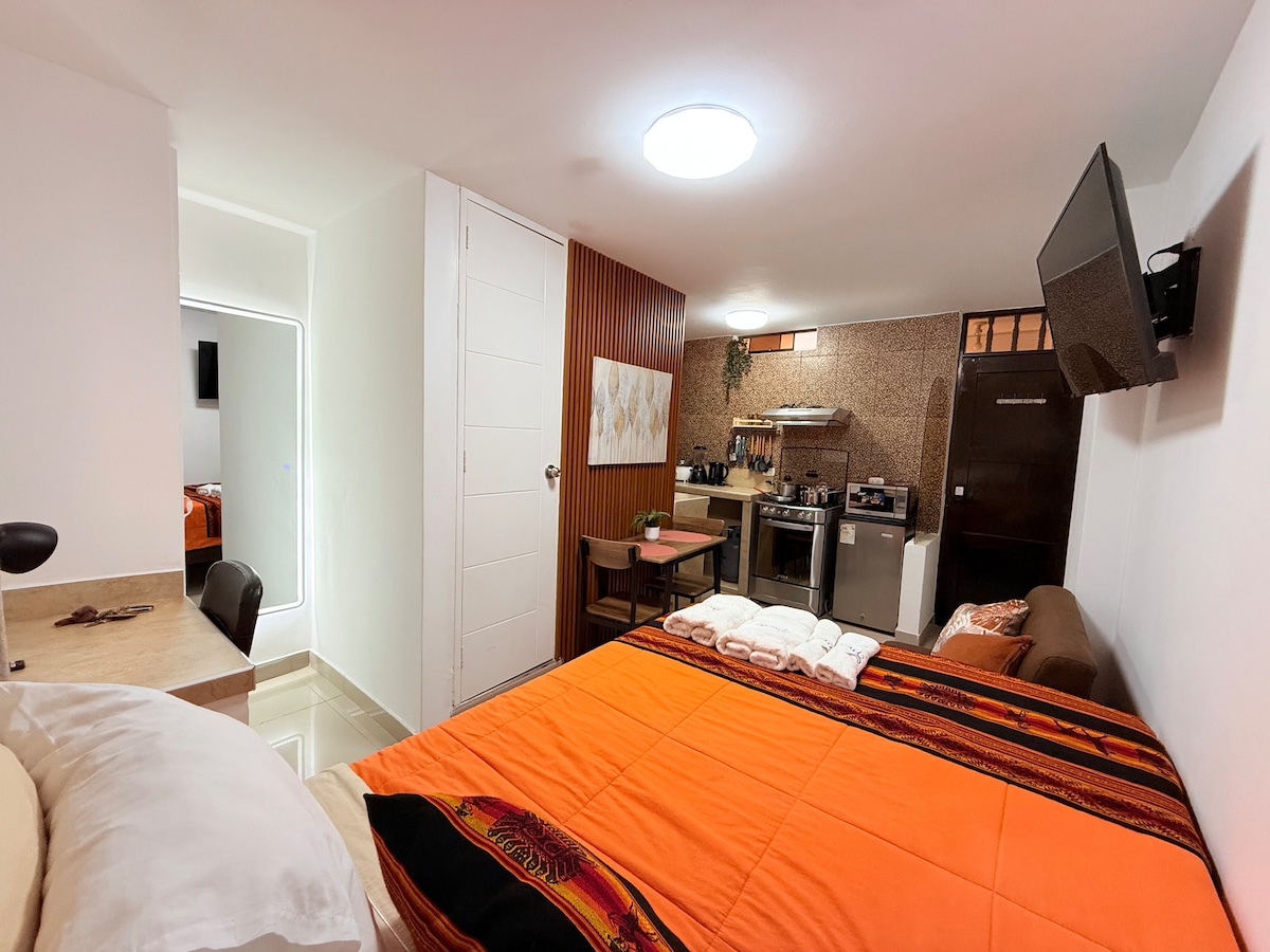 CAMA KING. Disfruta de la sencillez de este alojamiento tranquilo, con EXCELENTE UBICACIÓN, en La Merced, con ubicación céntrica, segura y residencial. Con restaurantes y supermercados a una cuadra. Con TERRAZA PROPIA incluida, cocina completa, y cine en el cuarto. Lava- seca incluida. Todos los servicios.