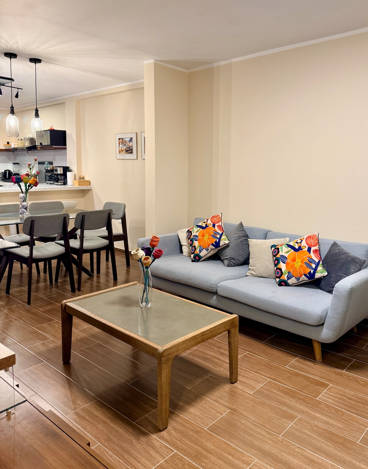 Departamento amplio con 115 m2 , elegante alojamiento con sala comedor y cocina americana de concepto abierto, es ideal para viajes en familia y por negocios, totalmente equipado para corta o larga estadía, esta ubicado en piso superior con potente iluminación natural y ventilación, con espacio para juego de niños. ( hay servicio de early check in y late check out con un valor adicional, segun disponibilidad )