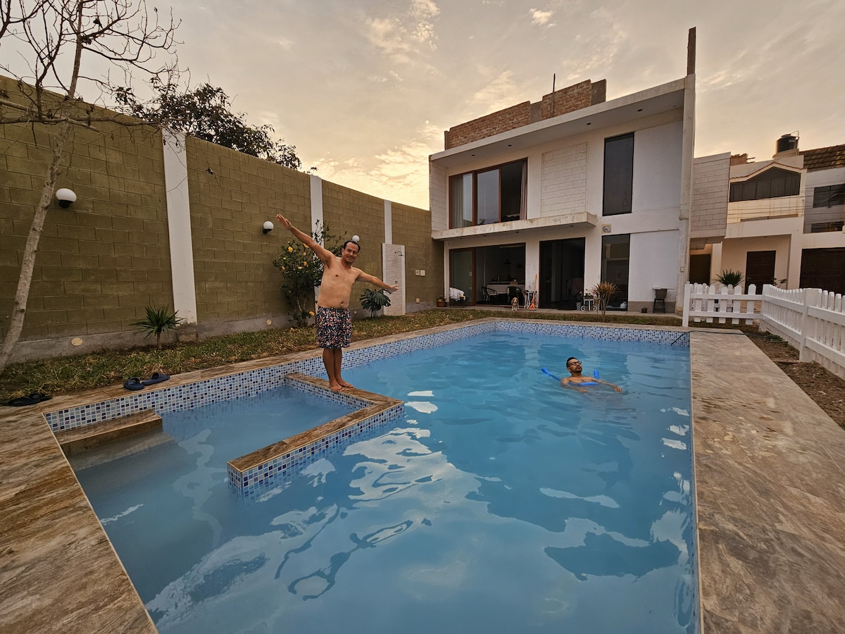 Sal de la rutina y de la ciudad, ven y relájate respirando aire puro, con un sol radiante, disfruta de una acogedora casa de campo desinfectada, con piscina, zona de parrillas, juegos para niños, amplio espacio para estacionamiento (gratuito). Cuenta con sala comedor, cocina, 3 cuartos, 1 baño completo, baño de visitas, TV, Wi Fi, Cable (Todos los ambientes están totalmente amoblados y equipados) Estamos a 4 min de la Ciudad de Laredo.