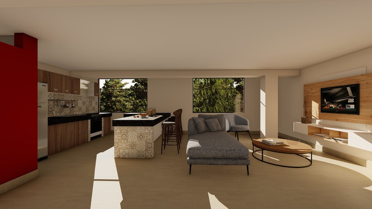 Disfruta la calma del campo en este cómodo y exclusivo minidepartamento con vista directa a la piscina. Cuenta con 2habitaciones ( 1 cama de 2 plazas) y (2 camas de 1 plaza), baño completo, cocina equipada y comedor. El espacio es privado, diseñado solo para ti y tus acompañantes, garantizando comodidad y descanso. Además, podrás disfrutar de las áreas comunes —piscina, jardines, terrazas y zonas de parrilla— compartidas cordialmente con otros huéspedes