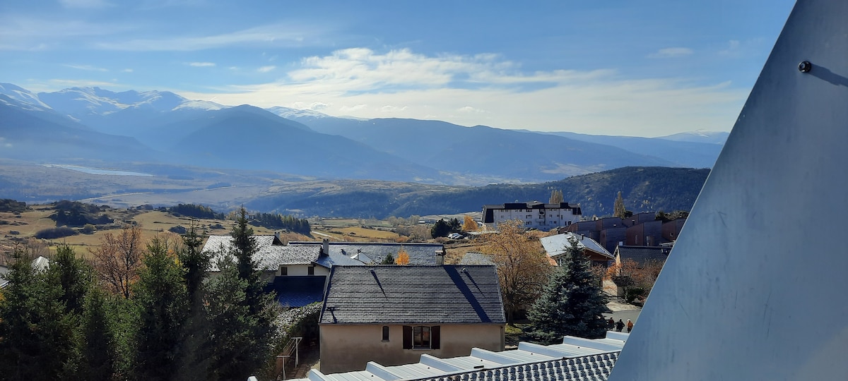 Charmant T2 duplex, à 5 minutes de remontées mécaniques, avec magnifique vue sur Cerdagne. Situé dans une petite résidence au calme, notre appartement est prévu pour 4 personnes. Grande chambre avec lit en 140 + grand placard, salle de bains spacieuse avec baignoire, salon-cuisine entièrement équipé avec lave vaisselle, lave linge, grand frigo, four, micro-onde, plaque à induction, fer à repasser, vaisselle, canapé conv., TV, WIFI, une cave, place garage . Le ménage à charge de locataires.