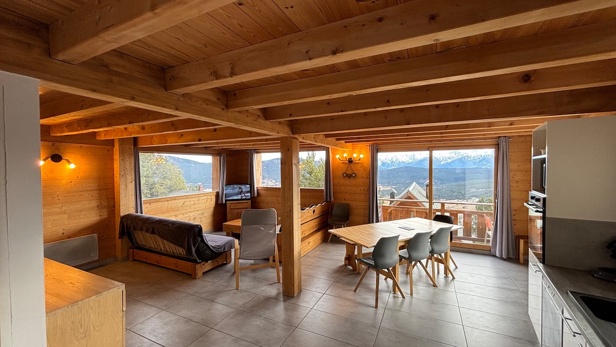 Dernier chalet avant les pistes ! Magnifique chalet chaleureux, familial et haut de gamme niché au cœur de la station de ski Pyrénées 2000 à Superbolquère, offrant un cadre idyllique pour des séjours inoubliables à la montagne, été comme hiver. 3 chambres et une mezzanine aménagée. Le chalet peut accueillir jusqu’à 9 personnes (6 adultes, 2 enfants et 1 bébé). De larges baies vitrées et 2 terrasses dévoilent une vue panoramique exceptionnelle sur les pistes et les montagnes.