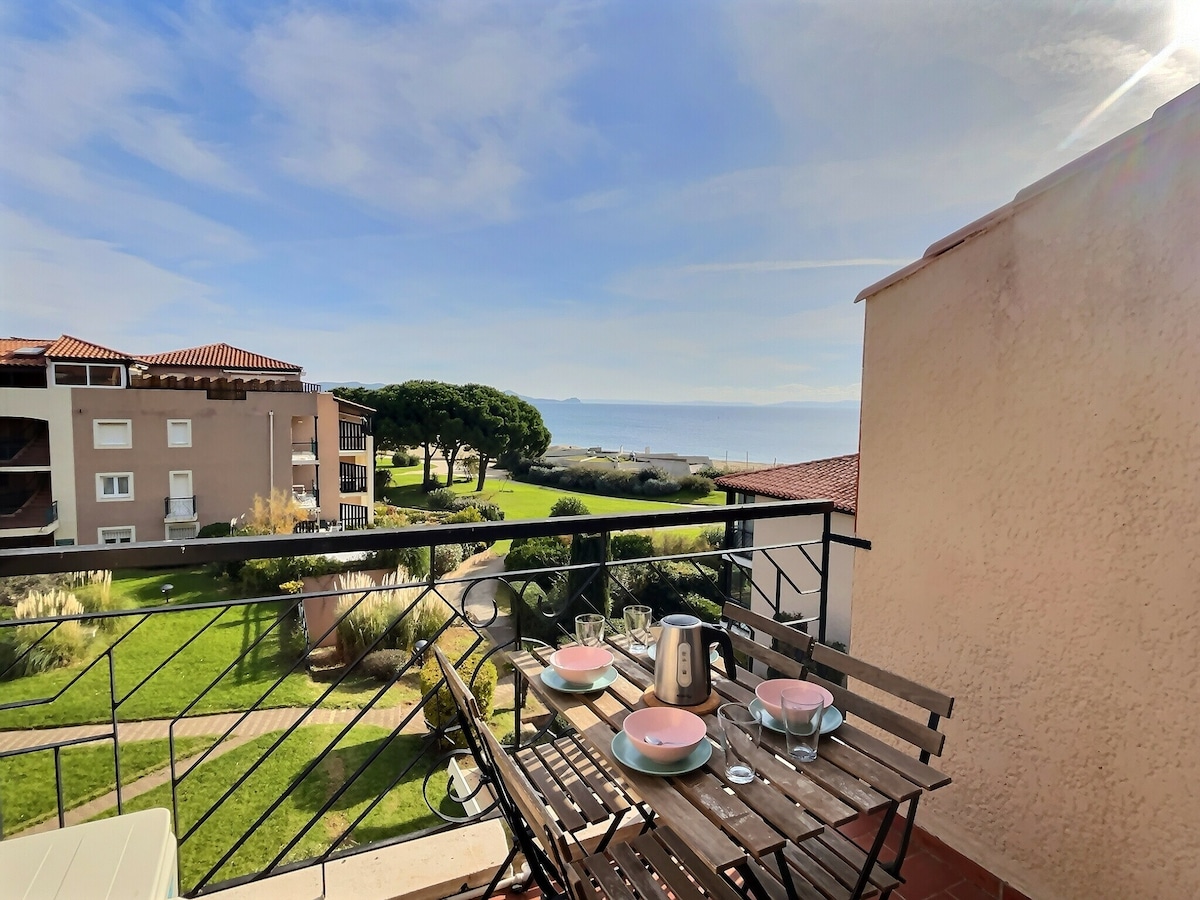 Bel appartement T2 avec terrasse vue mer au 1er étage d'une résidence. Accès à la piscine et aux terrains de tennis. Situé à 4km de la plage de l'Ayguade, 7km de l'aéroport et à 20 min à pied du centre-ville. Cet appartement comprend 1 chambre vue mer avec lit double et salle d’eau (baignoire), 1 cuisine équipée puis salon avec télévision, canapé et belle vue. Un hall d’entrée avec grand placard de rangement, toilettes séparées. Cet appartement bénéficie d’une place de parking et d’un ascenseur.
