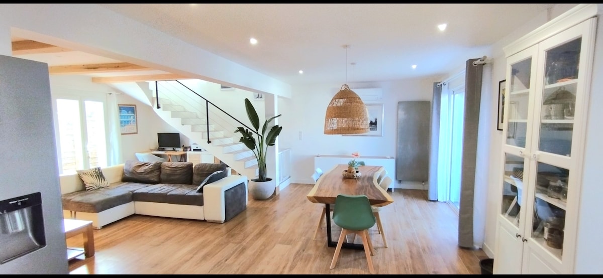 Maison 120 M2 idéale pour 2 adultes et 2 enfants ,décorée avec goût entierement rénovée en 2021.D' un grand confort avec son grand salon ouvert sur la terrasse et le jardin exotique , par deux grandes baies vitrées, vous profiterez de ce cadre apaisant pour passer de bons moments . Quartier très calme à 400 mètres du centre village et de toutes commodités. Les plages et le port se trouvent à 3 km accessible aussi bien en vélo par des pistes cyclable qu'en voiture ou à pied.