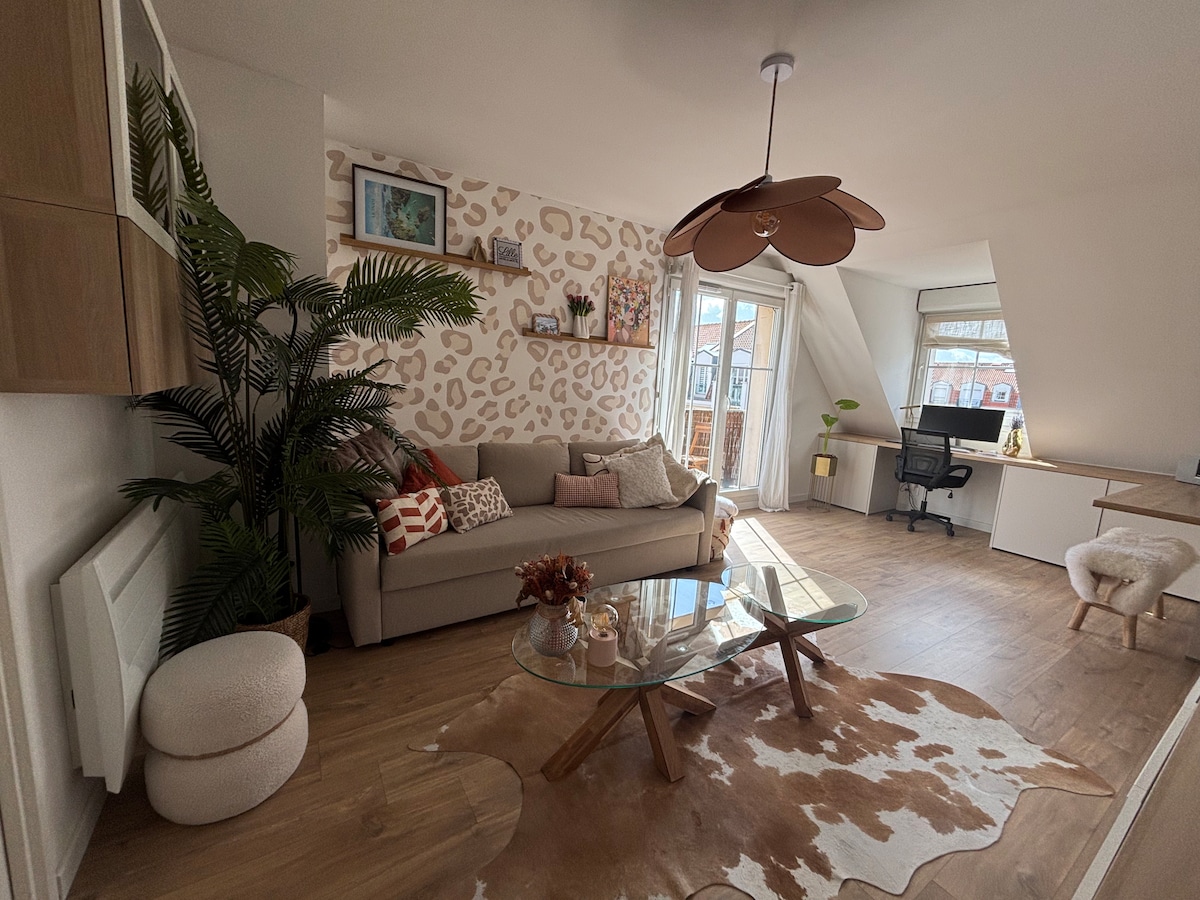 Dans une résidence art déco, au dernier étage, nous vous proposons un appartement de73 m2, avec 2 chambres, une cuisine équipée ouverte sur le séjour, une salle de bain et un toilette séparé (+1 balcon et une petite terrasse). L'appartement est situé à La Madeleine, au pied du tramway (à 2/ 3 arrêts des gares Lille Europe et L. Flandres), et le centre de Lille est aussi rapidement accessible à pied (12 min). La rue est calme, mais reste à proximité des commerces et de plusieurs parcs urbains.