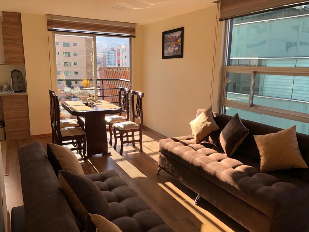 El departamento tiene Vista Espectacular, y Ubicacion Estrategica. DORMITORIO Cama Matrimonial escritorio Smart T.V. de 32" Closet BAÑO completo SALA COMEDOR 2 sofás grandes Mesa de comedor y 4 puestos COCINA Totalmente equipada CUARTO Lavadora/Secadora incluído TODO ESTA CERCA A PIE - Centro Historico - Casa de la Cultura - Universidades - Bancos - Supermercados - Farmacias - Parques - Transporte - Restaurantes - Guardias Seguridad 24/7 - Café, té,azúcar,sal,aceite, pimienta