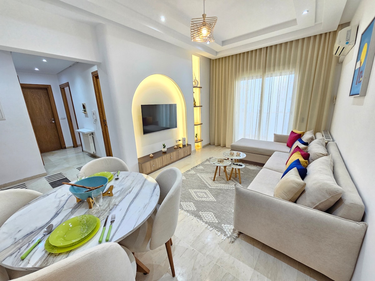 Ce luxueux appartement deux pièces, spacieux et baigné de lumière, offre une agréable vue sur la mer. Avec sa décoration moderne et soignée, il est idéalement situé au cœur de la Marsa, à 100 m de la plage, dans un immeuble neuf et sécurisé de la chic banlieue nord de Tunis. Son emplacement sur le boulevard principal vous permet de profiter à pied des commerces, restaurants et cafés. Entièrement équipé, il convient parfaitement pour un séjour professionnel ou des vacances reposantes.