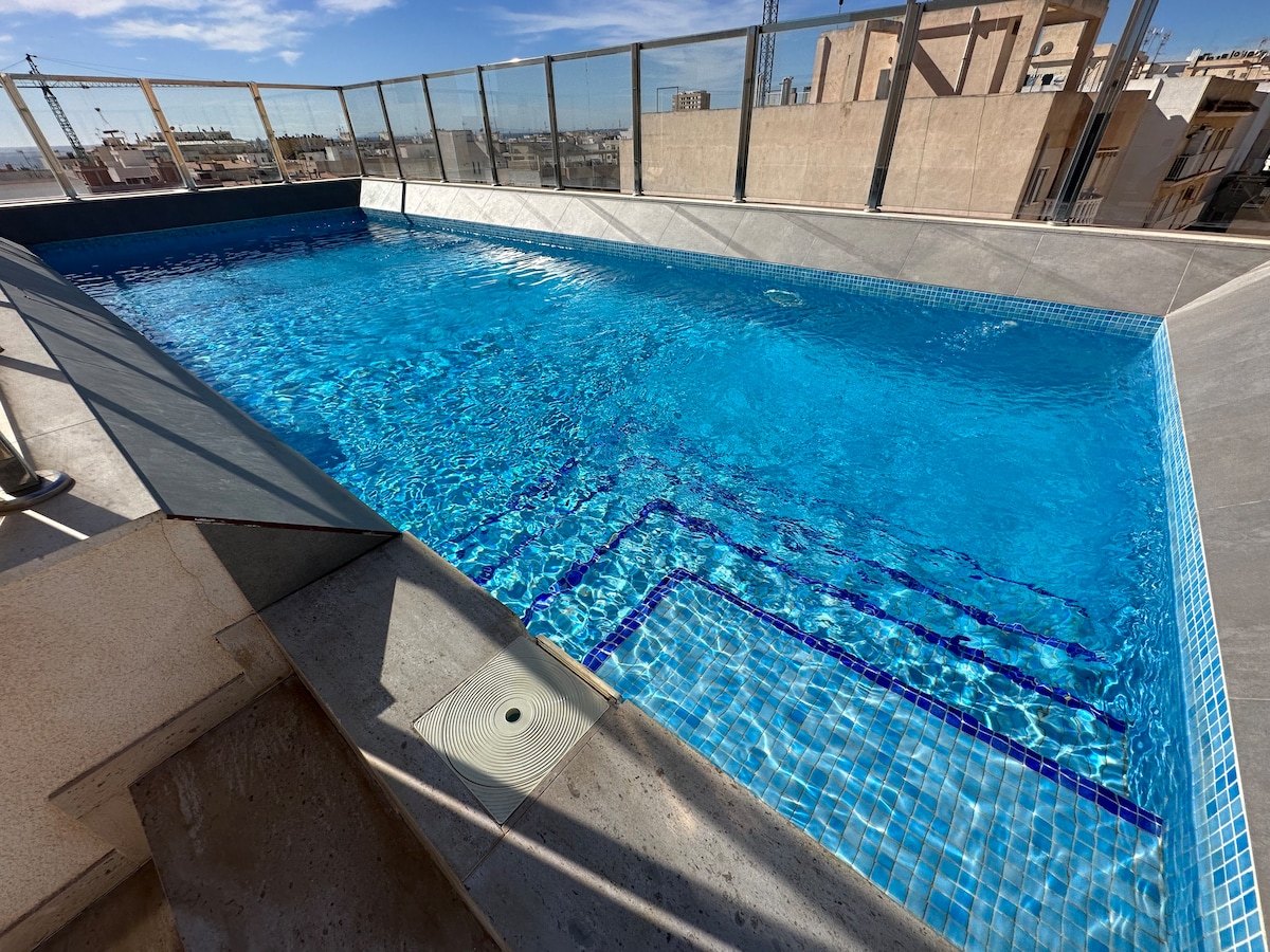 This modern apartment in Torrevieja is 100 meters from the beach and promenade. It has three bedrooms, two bathrooms, a spacious living room and a fully equipped kitchen. The stylish interior with clean lines and plenty of light creates a luxurious atmosphere. The spacious, sunny balcony offers a wonderful place to relax outdoors. In addition, the apartment has air conditioning and access to a communal swimming pool. You will also have access to a private parking in the building.