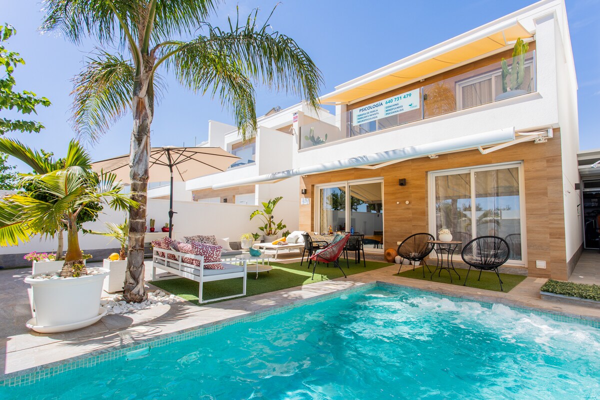Golf, strand, barer, restauranter, storby eller rolig avslapping. Ta med familien eller venner og nyt dette elegante bostedet. Den helt nye luksuriøse villaen har en rekke fasiliteter. Privat hage og bassengområde med ulike sitteplasser, solsenger og grill, perfekt for avslapning utendørs. Du kan boltre deg over tre etasjer med en stor takterrasse hvor du kan nyte utsikten mot byen og mot havet. Aircondition og raskt internett. Vi tilbyr 3 dobbeltsenger 160*200 og 4 enkeltsenger 90*200.