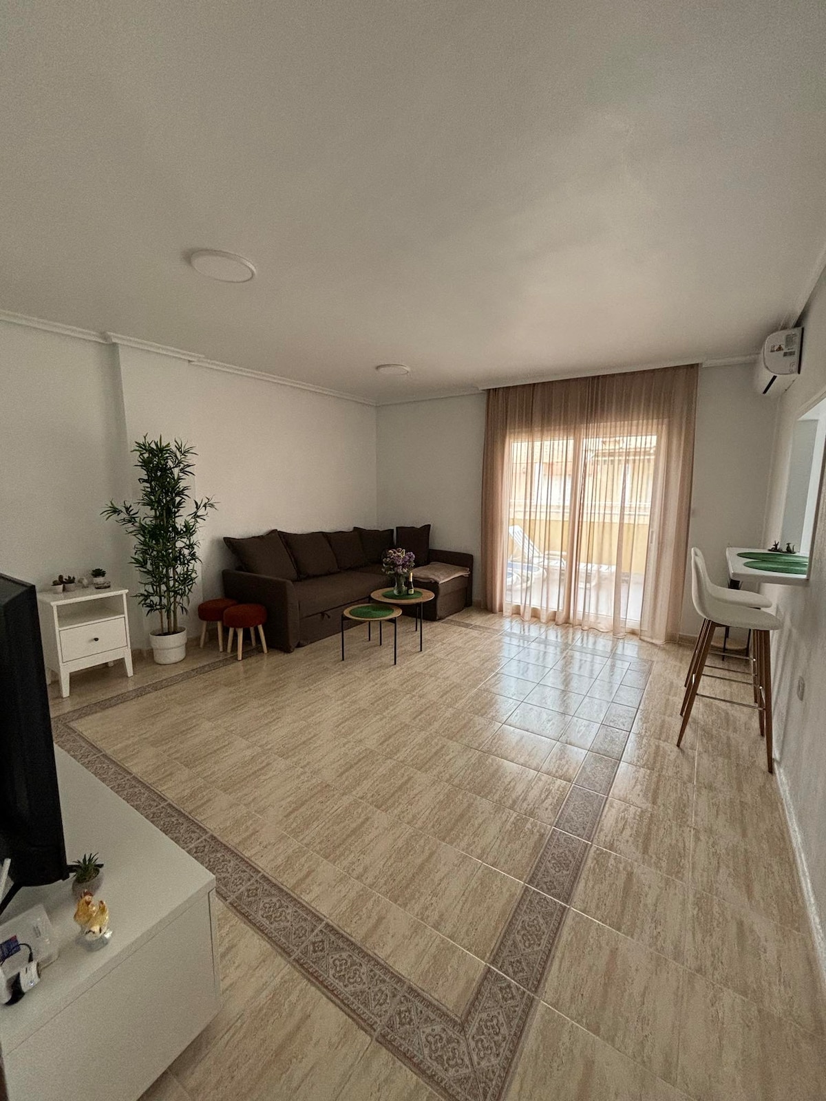 A lovely flat, ready to enter, in a calm condominium with pool and only 5 minutes away from the beach. Nearby you will find all services you might need. Ideal for families with children since it is equipped with cradle, high chair and playground.