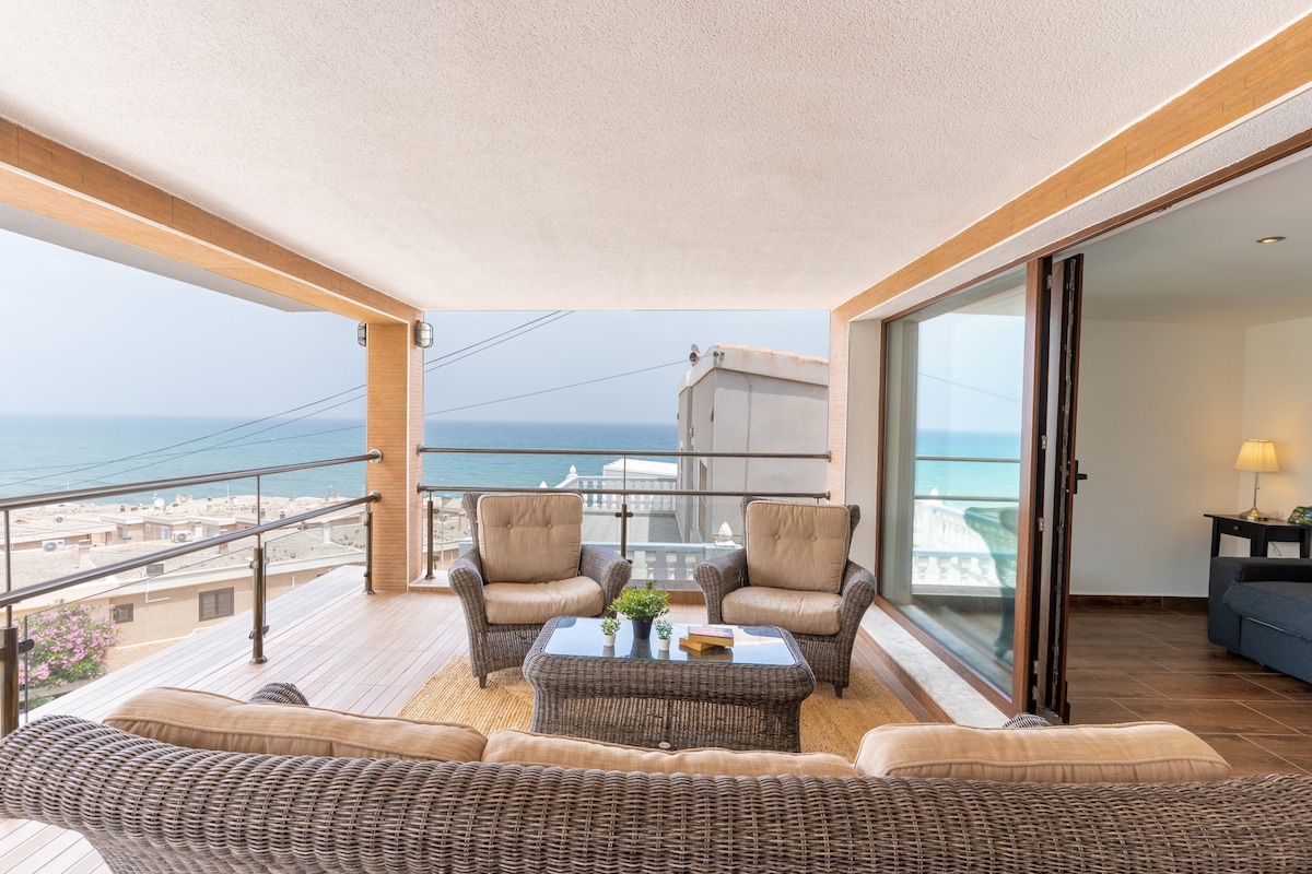 Ático con vistas espectaculares al mar. Orientación este y oeste. Dispone de salón comedor con sofá cama, un dormitorio con cama de matrimonio. Tiene aire acondicionado, cocina totalmente equipada con horno, vitrocerámica, lavavajillas, microondas, tetera, cafetera, tostadora. Se encuentra en un residencial tranquilo con piscina comunitaria y zonas verdes. Está ubicado en tercera planta sin ascensor. Distancia hasta la playa con arena 350m (menos de 5 min a pie). Importante no hacer ruido noche.