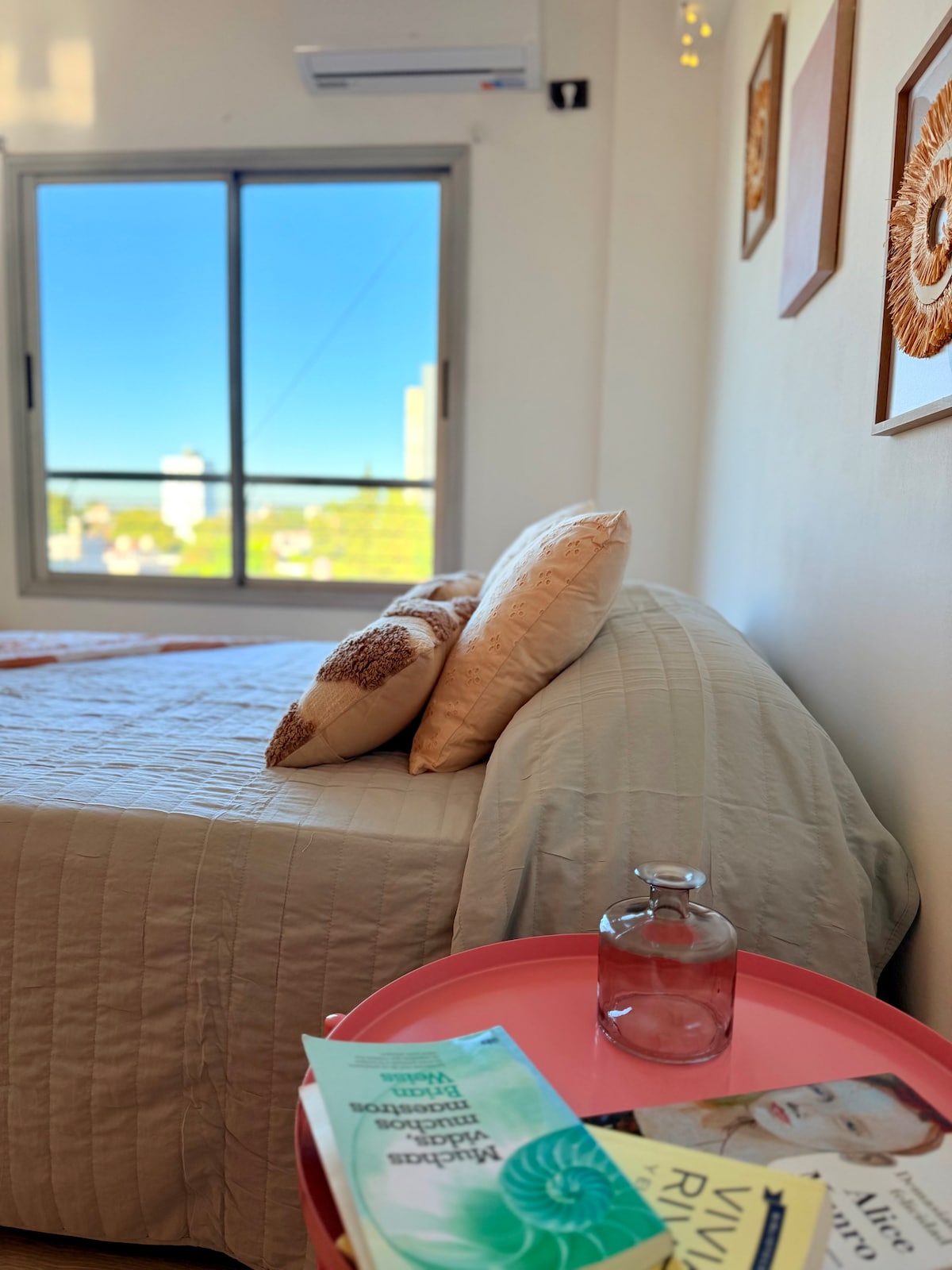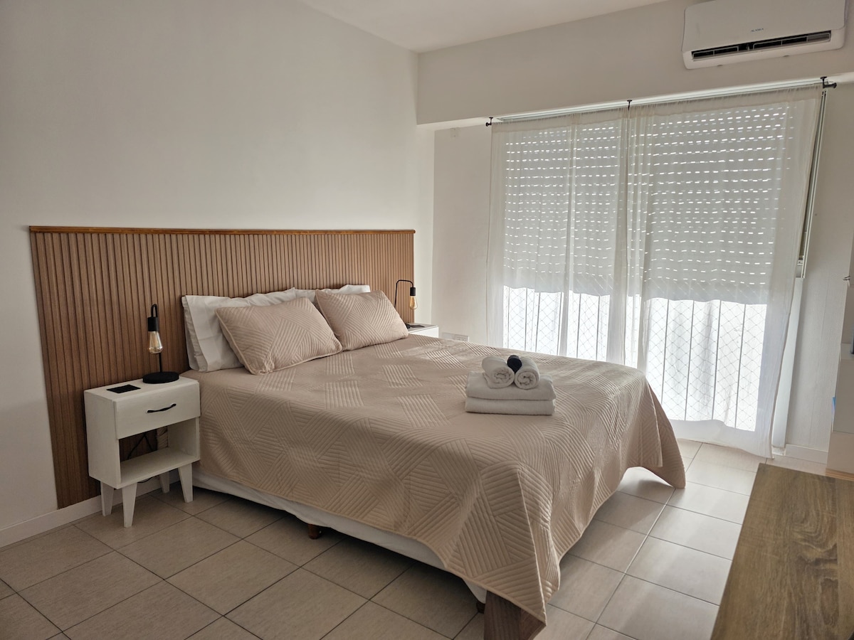 Luminoso monoambiente donde el cálido atardecer escapa por la ventana. Descansa en este tranquilo y hermoso departamento. Sábanas y toallas calidad hotelera, shampoo, acondicionador y jabon liquido para el cuerpo. Equipado con electrodomésticos, aire acondicionado, TV con cable y wifi, secador de pelo, luz de emergencia. A una cuadra del área de servicios con restaurantes, cafeterías, panadería p/ celiacos y veganos y transporte público.