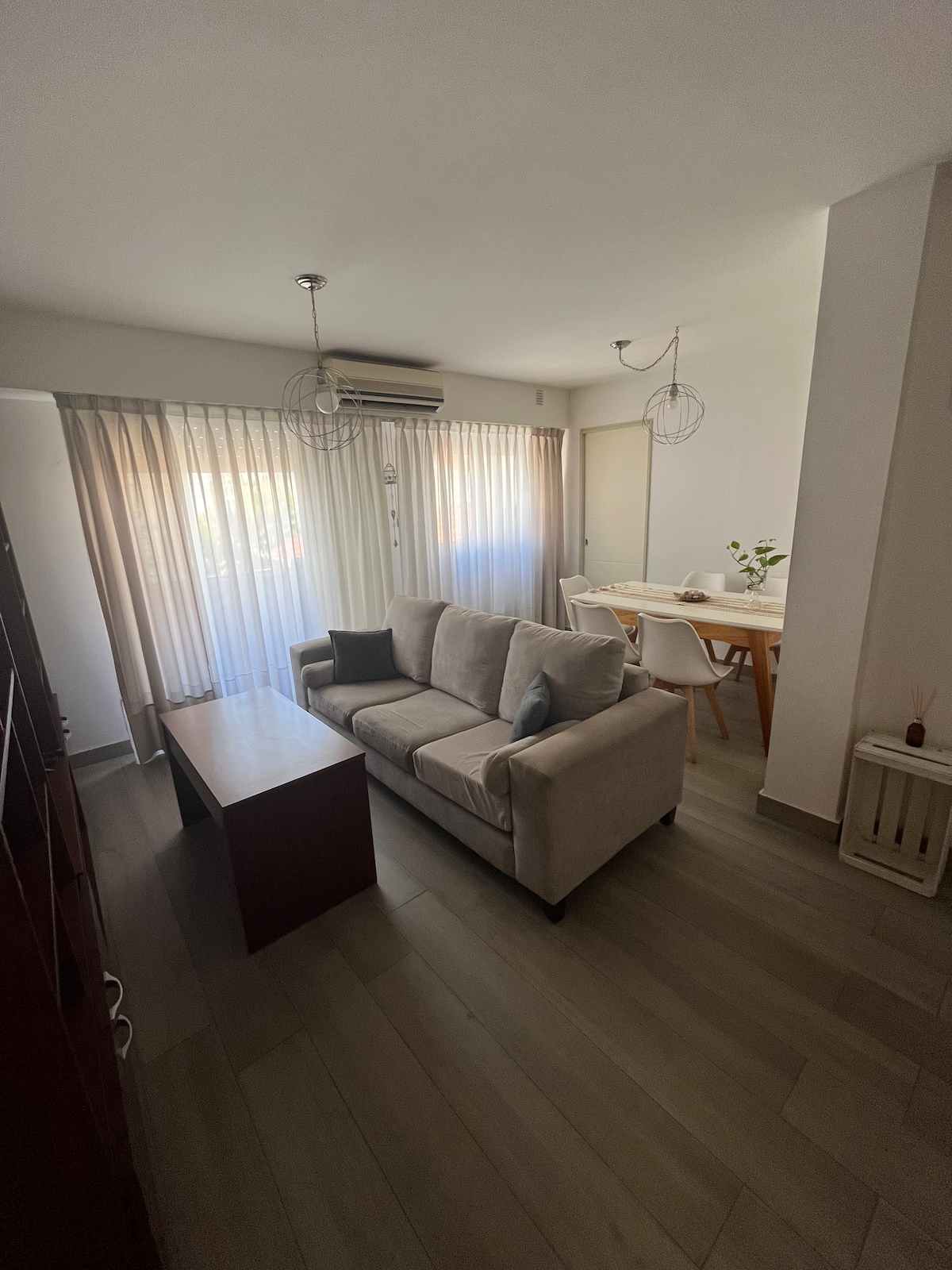Mi departamento es amplio y cómodo, tiene ventanas luminosas que dan a la calle. Recientemente se pusieron ventanas con doble vidrio. Tiene todas los elementos para que el viajero se sienta a gusto. Aire acondicionado frio/calor en la sala. Aire acondicionado frio en una habitación, Cocina amplia. Está en un 2º piso por escalera. A 18 minutos Aeropuerto Internacional de Ezeiza, en la zona, gran oferta gastronómica. Tren a Capital a 5 cuadras, buses y combis a Buenos Aires, en la esquina.